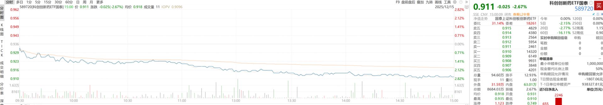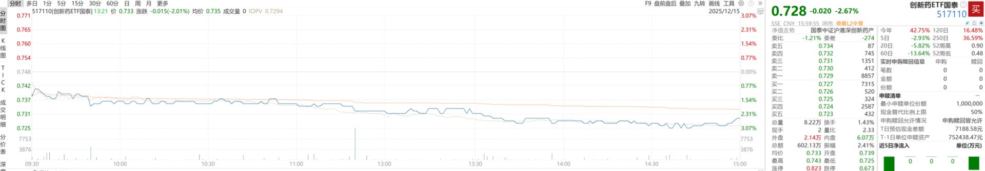 每经编辑|赵云 12月15日,A股缩量下挫,算力硬件产业链普跌,大消费、保险行业走强。上证指数收跌0.55%报3867.92点,深证成指跌1.1%,创业板指跌1.77%,北证50跌1.09%,科创50跌2.22%,万得全A跌0.63%,万得A500跌0.59%,中证A500跌0.73%。A股全天成交1.79万亿元,上日成交2.12万亿元。 创新药ETF(517110)、科创创新药ETF(589720)单日下跌2.67%