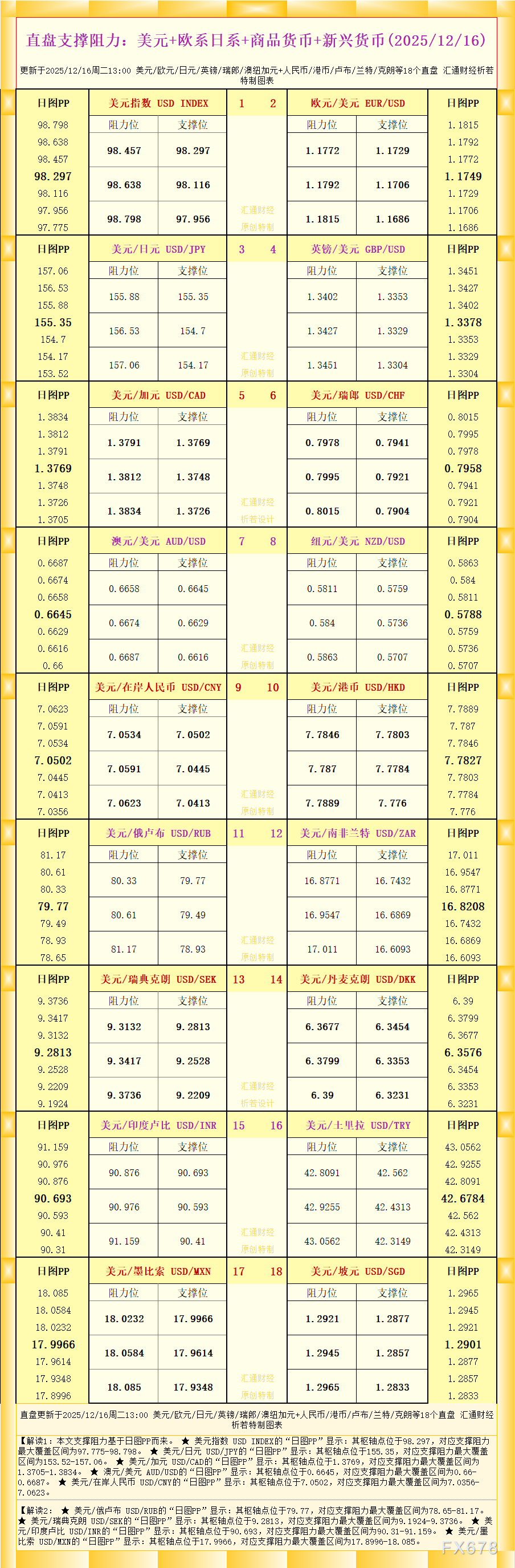 0一张图看直盘支撑阻力:美元+欧系日系+商品货币+新兴货币,更新于2025年12月16日周二13:00,具体美元/欧元/日元/英镑/瑞郎/澳纽加元+人民币/港币/卢布/兰特/克朗等18个直盘,更多详见汇通财经析若特制图表中的内 ...