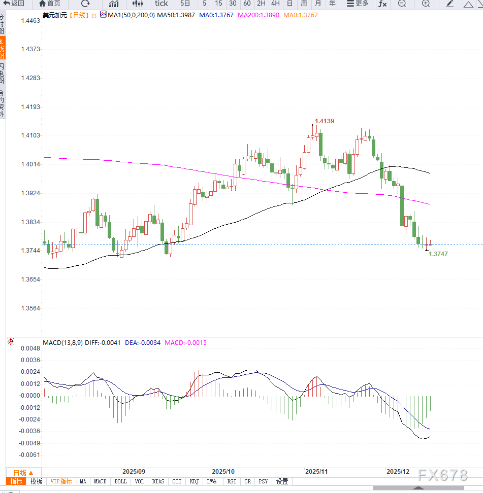 周二亚洲交易时段,美元兑加元维持低波动运行,整体围绕1.3775一线整理。市场观望情绪浓厚,主要原因在于延迟公布的美国非农就业报告即将出炉。 ![]() 除非农数据外,美国11月零售销售数据和12月标普全球采购经理人指数初值也将受到关注。市场预计零售销售环比增长0.2%,若消费表现稳健,或在短期内对美元形成一定缓冲,但整体影响仍需结合就业和通胀前景综合判断。 相较之下,加元表现相对平稳。加拿大11月消费者物价指数数据显示,整体通胀年率为2.2%,略低于市场预期,但仍保持温和增长。 剔除波动较大的项目后,加拿大央行核心通胀指标维持在2.9%,显示潜在通胀压力仍处于可控区间。加拿大央行此前表示,基础通胀水平大致在2.5%左右,并预计在经济闲置产能与成本压力相互抵消的情况下,通胀将总体贴近2%的政策目标。 这一表态令市场对加央行政策保持相对稳定的预期,加元因此缺乏明显方向性驱动。 总体来看,在美国关键数据公布前,美元兑加元更多呈现整理走势,多空双方均保持谨慎。 从技术形态来看,美元兑加元整体仍处于短期震荡区间内运行。汇价在近期回落后未能进一步下破关键支撑,显示下方买盘仍具一定承接意愿,但反弹动能同样有限,反映出市场在重大数据前缺乏明确方向。 在下方结构上,1.3750附近构成短线重要支撑区域,该位置多次限制价格下行,一旦有效跌破,汇价可能进一步向1.3700整数关口靠拢,届时下行空间有望被打开。若1.3700失守,短期技术结构将明显转弱。 上行方面,1.3800关口成为当前首要阻力位,该区域同时接近前期整理区间上沿。若在美国数据推动下汇价重新站稳该位置,上方目标或指向1.3850一线。但在美元整体偏弱背景下,若缺乏持续性基本面利好,上行空间仍可能受到限制。 综合来看,技术面显示美元兑加元正处于方向选择前的蓄势阶段,关键支撑与阻力区间的突破情况,将为后续走势提供重要指引。 ![]() : 当前美元兑加元的横盘整理,反映出市场对美联储政策前景的高度敏感。美国非农就业数据的表现,或将成为打破震荡格局的关键触发因素。 在加拿大通胀相对稳定、政策预期较为清晰的背景下,汇价短期方向更多取决于美元端变化。若美国数据继续偏弱,美元兑加元存在进一步下探的风险;反之,强于预期的数据或仅带来阶段性反弹。
