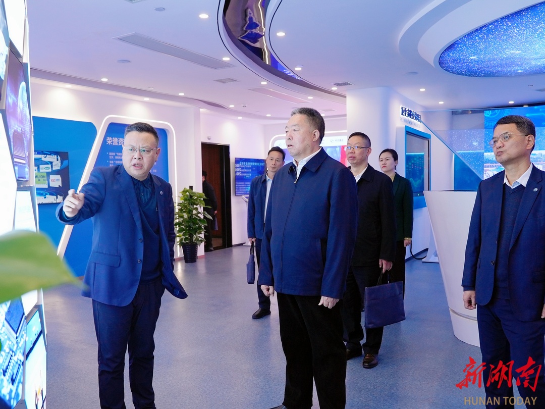 (12月16日,省政协主席毛万春率队来到湖南高新创投集团宣讲调研。图为毛万春在集团展厅调研。) 与湖南高新创投集团负责同志座谈交流时,毛万春对集团近年来探索形成以“科技+资本+人才”协同推动产业发展模式,推动企业整体运营效率稳步提升的做法给予充分肯定。