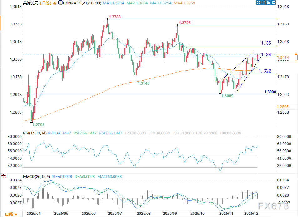 周二(12月16日)当前英镑/美元分时图呈现快速冲高走势,价格突破前期震荡区间,短期多头动能较强。盘中报1.3418/19,涨幅0.34%。 ![]() 美元能否迎来反弹? 美元在本年度最后阶段开局表现略显疲软,延续上周跌势。此前美联储释放进一步降息信号,同时市场愈发认为,若全球经济持续企稳,其他经济体的央行或将开启加息周期。 美国国内方面,本周经济数据发布与美联储官员讲话均较为密集。其中最受关注的是周二公布的11月非农就业报告。市场预期新增就业人数或温和增长至5万人左右,失业率将小幅升至4.5%。若数据不及预期,可能促使市场提前押注美联储降息;反之,若数据表现强劲,则有望推动美元大幅走高。 周四公布的11月消费者物价指数(CPI)同样值得关注,市场预期整体通胀率同比或小幅回升至3.1%。除经济数据外,美联储官员的言论也将对英镑/美元汇率预测产生影响。其中,纽约联储主席约翰·威廉姆斯定于周一晚些时候发表讲话;周三,美联储理事克里斯·沃勒等官员也将对经济前景发表观点。 市场聚焦英国央行,降息预期主导情绪 除美国外,欧元区、日本、英国等多国央行本周均将召开议息会议。对于英镑/美元交易者而言,最大的风险事件或来自周四的英国央行利率决议,本周初英镑已与美元同步出现贬值趋势。 上周英国公布的10月国内生产总值(GDP)数据不及预期,英镑随即承压走弱。近期英国通胀率的持续回落、经济增长势头的减弱以及劳动力市场状况的缓解,共同为英国央行本周再次降息提供了充分理由。这些因素甚至足以促使在决策中扮演关键摇摆角色的英国央行行长安德鲁·贝利,转向支持本周的降息决议。与此同时,上个月英国政府公布预算案后引发的英镑反弹行情,目前看来已完全结束,进一步为英镑的疲软走势奠定了基础。 在英国央行公布利率决议前,市场还将迎来英国劳动力市场数据及11月消费者物价指数。市场预期英国整体通胀率或小幅回落,但核心通胀率与服务业通胀率仍将维持黏性。对于当前的降息预期而言,周三发布的11月CPI数据是最后一个潜在“障碍”——鉴于英国经济增长放缓及劳动力市场宽松的大背景,除非此次通胀数据出现大幅超出预期的上行表现,否则很难改变英国央行本周降息的既定轨迹。 当前市场定价显示,英国央行本周四降息的概率高达85%,降息几乎已成定局。市场预计英国央行行长安德鲁·贝利将以5:4的微弱投票优势,宣布将基准利率下调至3.75%。除此之外,市场将密切关注其对2026年货币政策的前瞻指引,目前市场预期英国央行明年或将累计降息50个基点。若释放更强的宽松信号,英镑/美元汇率可能遭遇大幅下挫。 技术分析 ![]() 目前英镑/美元汇率运行于上升三角形形态之中,下行风险正逐步累积。若1.3350支撑位被有效跌破,汇价或将进一步下探,后续支撑位依次看向1.3220、1.3100区域,若抛售压力持续加大,关键心理关口1.3000或将面临考验。 上行方面,汇价已1.3400关键关口,下一阻力指向1.3500关口。