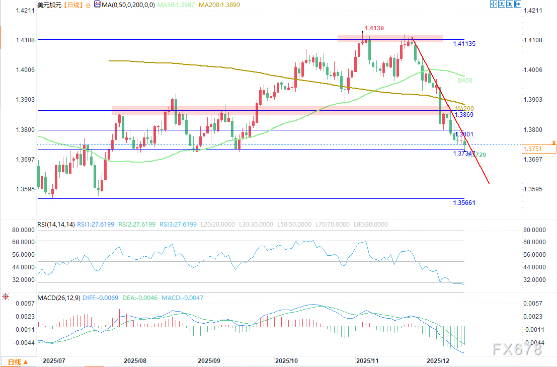 过去五个交易日,美元/加元汇率下跌逾0.7%,加元占据优势,短期看跌趋势保持稳定。当前,汇率面临的抛售压力持续高企,这一态势在美国就业数据发布后尤为明显,数据进一步强化了美元的结构性疲软格局。此外,加拿大本周公布的通胀数据,继续支撑加拿大央行维持中性利率的政策导向,助力加元保持稳健走势。若上述两大因素持续发酵,未来几个交易日,抛售压力或将继续主导美元/加元的汇率走势。 ![]() 因近期美国政府停摆,10月和11月非农就业数据推迟至今日公布。尽管最新公布的11月数据表现向好——新增就业岗位6.4万个,超出5万个的市场预期,但10月数据却录得大幅减少10万个,凸显出美国劳动力市场的显著降温。 尽管此次非农数据喜忧参半,但美联储尚未调整其对明年的政策展望。10月的疲弱数据,为上周美联储降息的决策提供了合理性支撑;而11月就业数据的反弹,则佐证了央行在1月议息会议上维持中性立场的可能性。更明确的一点是,劳动力市场的波动状况表明,2026年美联储不会考虑加息,反而可能在维持中性利率与进一步降息之间灵活切换,以稳定就业形势。 不过,非农数据公布后的市场环境并未提振美元需求。一方面,劳动力市场数据仍处于敏感区间,削弱了美元资产的吸引力;另一方面,美联储尚未就2026年的政策方向释放明确信号,加剧了市场整体的观望情绪,同时动摇了美债的稳定性。政策前景的不明朗,降低了海外资本对美元资产的配置意愿,从而压制了美元需求。 衡量美元对一篮子货币汇率的美元指数(DXY)走势,正是这种疲软态势的直观体现。美元指数延续了稳健的下行趋势,目前交投于100点下方,并向98点区间逼近,这是自10月初以来的最低水平区间。这一走势印证了美元短期的持续走弱格局。 综合来看,此次就业数据的发布,非但没有增强市场对美国经济的信心,反而加剧了不确定性。只要这种局面持续,美元的结构性弱势就将持续利好加元,推动加元稳步走高,并在未来几个交易日持续对美元/加元汇率形成抛售压力。 加拿大通胀现状如何? 加拿大统计局于本周一公布消费者物价指数(CPI)数据,通胀水平呈现中性特征。11月整体通胀率维持在2.2%,与10月持平。尽管近期通胀未出现上行势头,但仍略高于加拿大央行2%的政策目标,这意味着通胀形势仍需持续关注。 该通胀数据虽不意味着加拿大央行会在2026年采取激进的货币政策立场,但明确指向央行将维持中性利率导向。相较于美联储可能进一步降息的预期,加拿大更为稳定的利率环境,有望持续提升加元计价资产的吸引力,吸引海外资本流入,从而在短期内支撑加元需求。 若这种中性利率预期持续,加元需求或将保持稳定,并成为中期内推动美元/加元汇率承受持续抛售压力的关键因素。 美元/加元技术分析 ![]() 新下行趋势形成:自11月汇率触及高点以来,美元/加元已逐步构建起新的短期下行趋势。在此过程中,多头并未展开有力反攻,这一下行趋势也因此成为主导短期行情的核心技术结构。不过,鉴于近期抛售力度较大,汇率可能出现短期反弹修正。这类反弹虽不足以逆转整体下行趋势,但或令未来几个交易日市场呈现短暂的看涨情绪。 相对强弱指数(RSI):相对强弱指数线持续运行在50的中性分水岭下方,反映出过去14个交易周期内空头动能的主导地位。不过,该指标正逼近30的超卖区间,这可能预示着过度抛售引发的短期市场失衡,进而为汇率开启短期反弹修正窗口创造条件。 指数平滑异同移动平均线(MACD):MACD柱状图始终位于零轴下方,体现出短期移动平均线维度的空头力量优势。若这一态势延续,汇率可能进入震荡整理阶段,为美元/加元走势图上出现更具结构性的多头修正行情提供契机。 关键多空价位参考 关键阻力位:1.38690——这是图表上的关键中性水位,同时与200周期简单移动平均线相重合。若汇率回升至该区间,可能重新激活看涨情绪,并对当前主导的下行趋势构成挑战。 即时阻力位:1.38010——这是近期形成的中性整理区间,或对短期反弹修正构成阻力。 关键支撑位:1.37347——这是8月至9月期间的关键回撤区间,也是最重要的空头目标位。 一旦跌破该支撑,将强化市场主导的看跌情绪,并为汇率打开进一步下行空间。