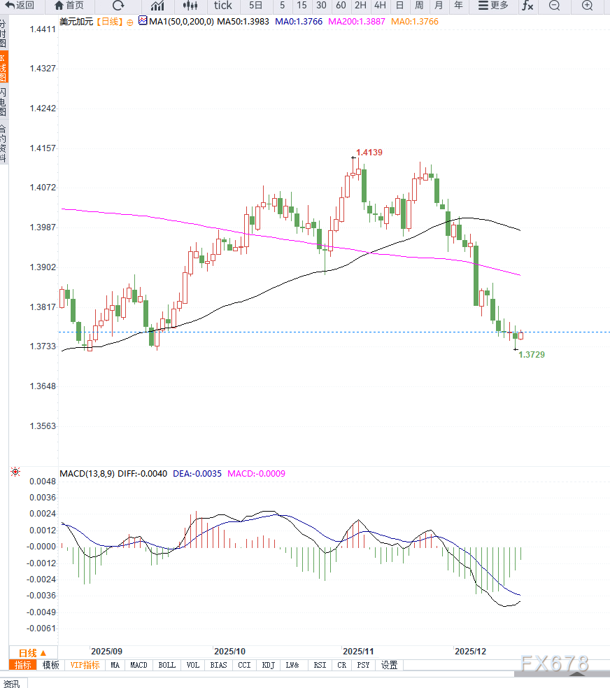 周三亚洲交易时段,美元/加元自前一交易日低点1.3730回升,目前交投于1.3770附近。短线反弹主要受美元支撑以及加元受到加拿大央行政策限制的影响。 ![]() 美联储官员对未来货币政策路径意见分歧:部分官员预计2026年仅一次降息,有些官员认为无需再降息,而市场交易者普遍预计明年可能有两次降息。 此外,美国总统特朗普将面试美联储理事Christopher Waller作为下一任主席候选。Waller被视为今年提出最连贯降息逻辑的人选之一,可能有助于协调内部政策分歧,对未来市场预期具有一定导向作用。 加元方面,加拿大央行维持利率在2.25%,并表示政策水平“接近合适”,抑制了市场对近期进一步宽松的预期。 加上加拿大最新通胀数据,整体CPI维持在2.2%,精简平均通胀降至十个月低点2.8%,进一步显示价格压力正在向央行目标回归,这限制了加元进一步走强的空间。 综合来看,美元/加元短线呈现震荡反弹格局,受美元支撑和加元政策预期双重作用,汇价自低位回升。 从日线图形上来看日线显示汇价自低位反弹,短期均线呈空头排列,但动能指标显示仍有震荡特征,4小时图显示回升过程遇阻于1.3800附近,短线可能在1.3730–1.3800区间震荡。 ![]() 美元/加元当前走势更多体现为美元支撑与加元政策限制的博弈。美国就业和零售数据表现参差不齐,使市场对美联储未来降息存在分歧,而加拿大央行利率维持及通胀回落则抑制加元进一步走强。