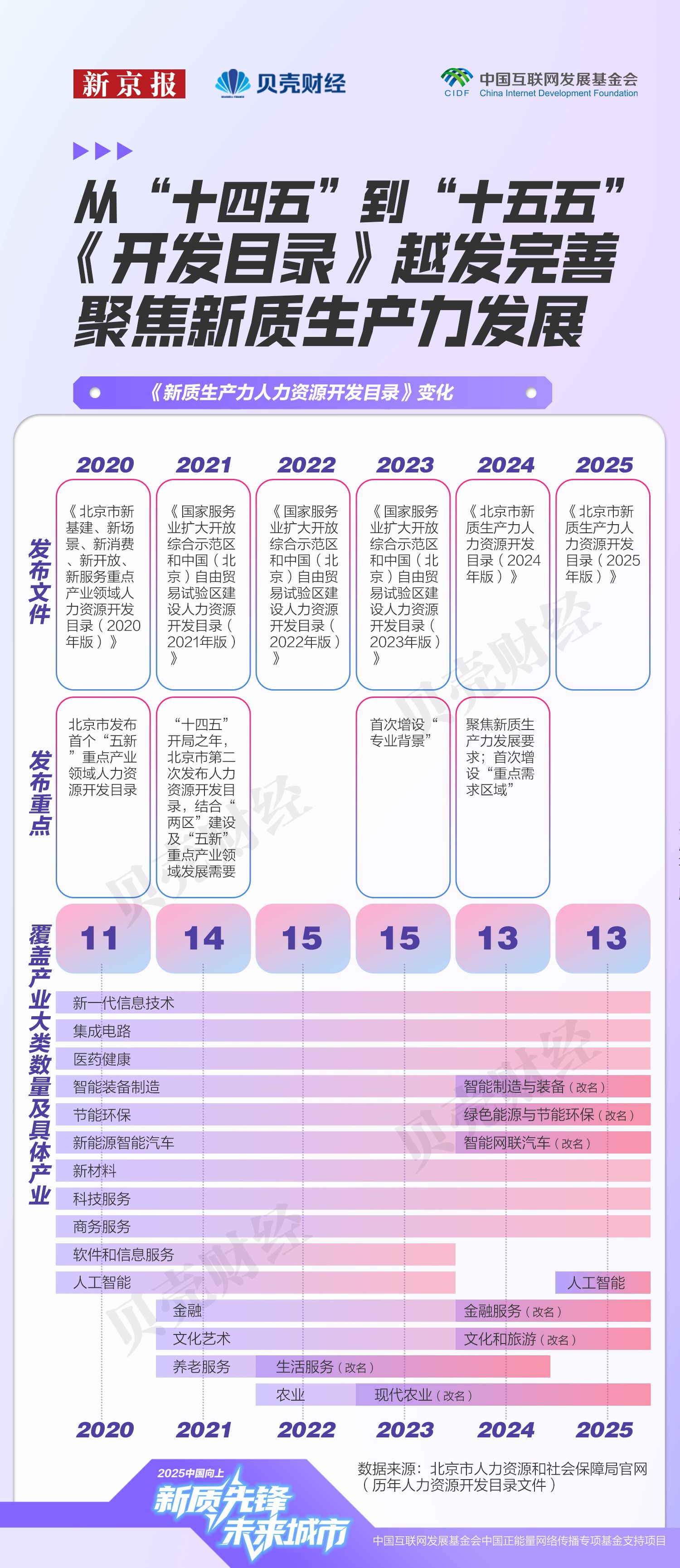 在这条高需求主轴之外,东城、西城、昌平、丰台、通州五区构成了北京新质生产力人才需求的第二梯队,各区凭借功能定位形成差异化布局。其中,东城与西城呈现“科技+金融+服务”融合特征,主要在金融服务、数字治理、智慧文旅等场景招募复合型人才;昌平区与经开区同样承担科技成果落地转化职能,人才需求集中于人工智能、集成电路与医药健康产业。 从“十四五”到“十五五”:人工智能重新单列,北京人才需求进一步聚焦 2020年,北京首次发布“五新”重点产业领域人力资源开发目录,基于市场招聘信息设定人力资源开发评级指标,用于反映产业人才紧缺程度,此后这份目录每年更新。至2021年,“十四五”开局之年,北京在“两区”建设及“五新”重点产业领域发展背景下,对目录进行重要修订,覆盖产业大类由11个增加至14个。 2024年目录升级为《新质生产力人力资源开发目录》,并在2025年继续更新。从设定人才需求评级,到增设重点需求专业及重点需求区域,目录体系逐步完善,已成为北京人才供求市场的重要“晴雨表”。