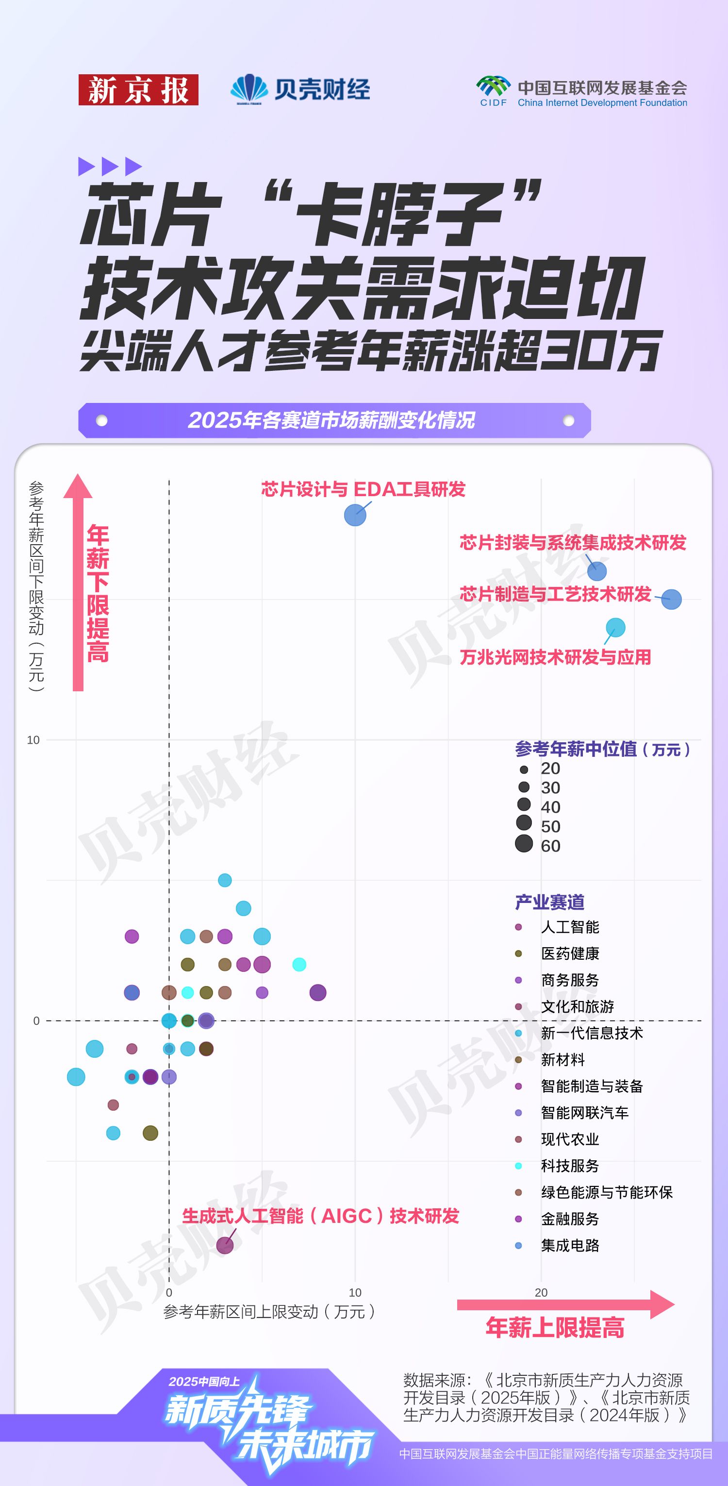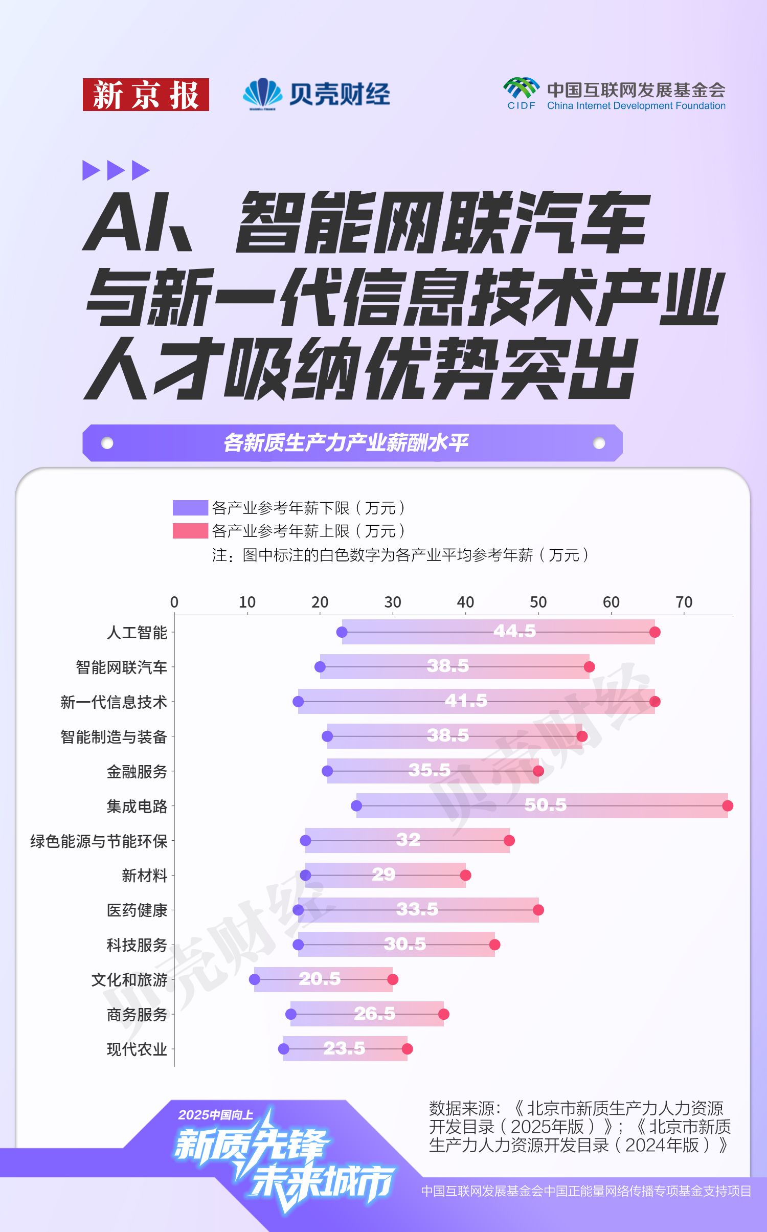 这种趋势并非集成电路产业独有。新京报贝壳财经记者基于《目录》统计发现,在与2024年具有可比数据的52个核心领域中,30个领域的参考年薪上限提高,占比近六成,其中20个领域薪酬区间整体上移。 市场薪酬普遍走高的背后,是“塔尖人才”愈发紧缺。中国高技术产业发展促进会、中兴通讯联合发布的《新质生产力数字人才白皮书》指出,中国数字人才金字塔呈现出“塔基庞大、部分领域甚至供给过剩,塔尖人才极度稀缺”的特点,尤其在人工智能算法、云计算架构、集成电路设计等方向,高端领军型和创新型人才的供给还远远不足。 人工智能产业在积极招揽尖端人才的同时,也在推动人才结构走向多元。今年《目录》将人工智能单列后,核心方向由2024年的“数字人技术”“人工智能操作系统”,扩展至2025年的“具身智能”“大模型高效计算”“多模态语义对齐与认知推理”“产业智能化研发与应用”等多个领域。这意味着北京在人工智能赛道上,不仅寻求前沿技术创新,还在加速推动AI在医疗健康、金融风控、教育培训、交通物流、智慧城市等场景落地,打通应用端“最后一公里”。 生成式人工智能(AIGC)领域的变化尤为典型。今年,其参考年薪区间明显扩大,上限上调5万元、下限下调18万元,同时新增AI产品经理、内容审核工程师等角色,表明需求正由底层研发延伸至用户体验优化与商业化转化,岗位链路进一步完善。 从人才到人效:高营收与岗位高薪酬并行,智能汽车人均创收近328万元 《目录》基于岗位信息所呈现的人力资源开发评级与参考薪酬,不仅反映出招聘端岗位需求的冷热变化,也折射出各个产业对人才的付费意愿及吸纳能力。 其中,人工智能、智能网联汽车、新一代信息技术三大赛道的人才需求与薪酬水平均位于前列,参考年薪上限普遍集中在57万至66万元区间,稳居第一梯队,显示出突出的人才吸纳力与企业支付能力。