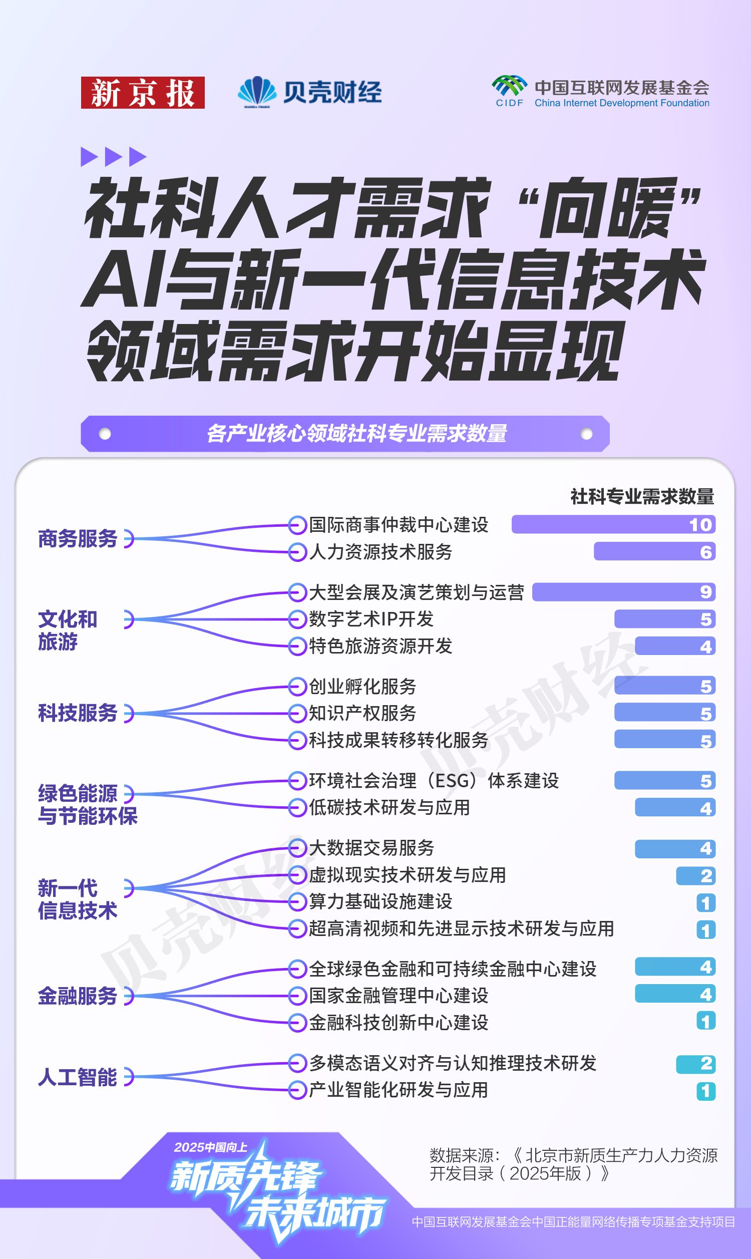 2025年,北京新质生产力领域人才需求进一步向关键环节、尖端人才倾斜,岗位招聘信息越发精准聚焦。“AI+”正在成为跨行业的共同语言,也向更多社科与交叉专业敞开大门。 “十五五”开局之年,“科技自立自强水平大幅提高”被作为经济社会发展的主要目标之一,强调加快形成教育、科技、人才一体的发展格局,在重点领域实现关键核心技术加速突破和更多从“并跑”到“领跑”的跨越。 围绕这一战略部署,中央明确提出要抓住新一轮科技革命和产业变革的历史机遇,统筹推进教育强国、科技强国、人才强国建设。12月10日至11日举行的中央经济工作会议再次提出,要制定一体推进教育科技人才发展的方案,建设包括北京(京津冀)在内的国际科技创新中心。 这既为首都在“十五五”新阶段承担国家科技力量主阵地、人才聚集高地的角色指明了方向,也对北京优化人才结构、提高人才质量、促进区域协同发展提出了更高要求。据北京人才发展战略研究院数据,北京坐拥90多所高校、上千家科研院所和77家国家重点实验室,数字人才规模占全国近五分之一。 今年9月,北京市人力资源和社会保障局发布报告称,本市数字人才需求缺口持续扩大,对高水平、复合型数字人才的需求尤为迫切。次月,北京市发布2025年《北京市新质生产力人力资源开发目录》(以下简称《目录》)——这份由1330万条岗位信息汇总而成的人才需求报告显示,随着北京新质生产力重点领域快速发展,复合型塔尖“人才”正从扩容走向需求细化。 哪些快速增长的重点领域最缺人才?新京报贝壳财经记者全面梳理这份目录,透视北京新质生产力发展的人才密码:作为“创新大脑”的海淀和企业数量最多的朝阳,共同构成北京人才最密集、需求紧迫的两大新质生产力核心区;同时,北京人才市场资源进一步向关键环节、尖端人才倾斜,岗位招聘信息越发精准聚焦。而人工智能赛道的人才需求则走向多元化发展,从前端研发延伸至产品、用户体验、商业化链路等下游环节,“AI+”正在成为跨行业的共同语言,也向更多社科与交叉专业敞开了大门。 从西北向东南:海淀、朝阳“求才若渴”,大兴、经开成南翼承载区 北京的经济版图上,一条自西北向东南延展的“人才高压带”正逐渐凸显——海淀、朝阳、大兴、经开区构成人才需求最旺盛的主轴。 新京报贝壳财经记者梳理《目录》发现,海淀与朝阳在人才重点需求区域中出现频率最高,分别覆盖了58个新质生产力核心领域中的57个,既涉及具身智能、脑机接口、智能驾驶、6G研发等前沿技术,也延伸至知识产权、商事仲裁等配套服务,产业链条完整。 据北京市人力资源研究中心测算,截至2023年末,海淀区、朝阳区的高精尖产业从业人数均突破200万人,两区人才规模合计约占全市44%,是北京新质生产力人才储备和需求最集中的“双核心”。 但在同样“求才若渴”之下,海淀和朝阳呈现出结构差异:海淀高精尖产业人才密度接近九成,以科研型、技术型人才为主;朝阳虽然规模相当,但人才密度约69%。作为互联网3.0企业、跨国公司总部以及文旅商务等数字化场景的聚集地,更需要既懂技术、又通业务、兼具国际视野的复合型人才。