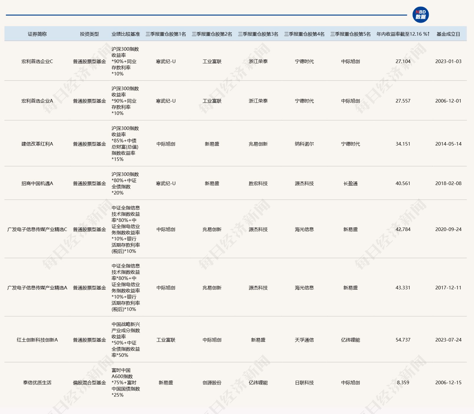 以前述泰信优质生活为例,这只成立于2006年12月15日的基金在今年三季报公布时,也将新易盛、中际旭创、寒武纪-U纳入前十大重仓股,新易盛是其第一大重仓股。然而,截至12月16日,该基金的年内收益率仅为8.36%。