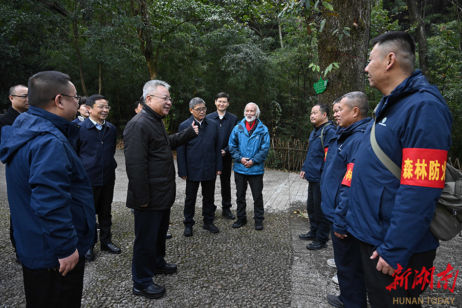 12月17日,沈晓明在莽山国家森林公园巡林。 莽山国家森林公园总面积1.98万公顷,森林覆盖率达90%,是全省面积最大的国家森林公园,物种资源丰富。沈晓明先后来到莽山国家森林公园枞树坝保护站、天台山原始次生林保护区,察看莽山动植物科普中心,并开展实地巡林,与林业专家、护林员深入交流,了解莽山生态环境保护、文旅产业发展、森林资源保护利用等情况。沈晓明还走进莽山消防救援站,察看物资配备和日常训练,了解森林防灭火、景区应急救援处置等情况。