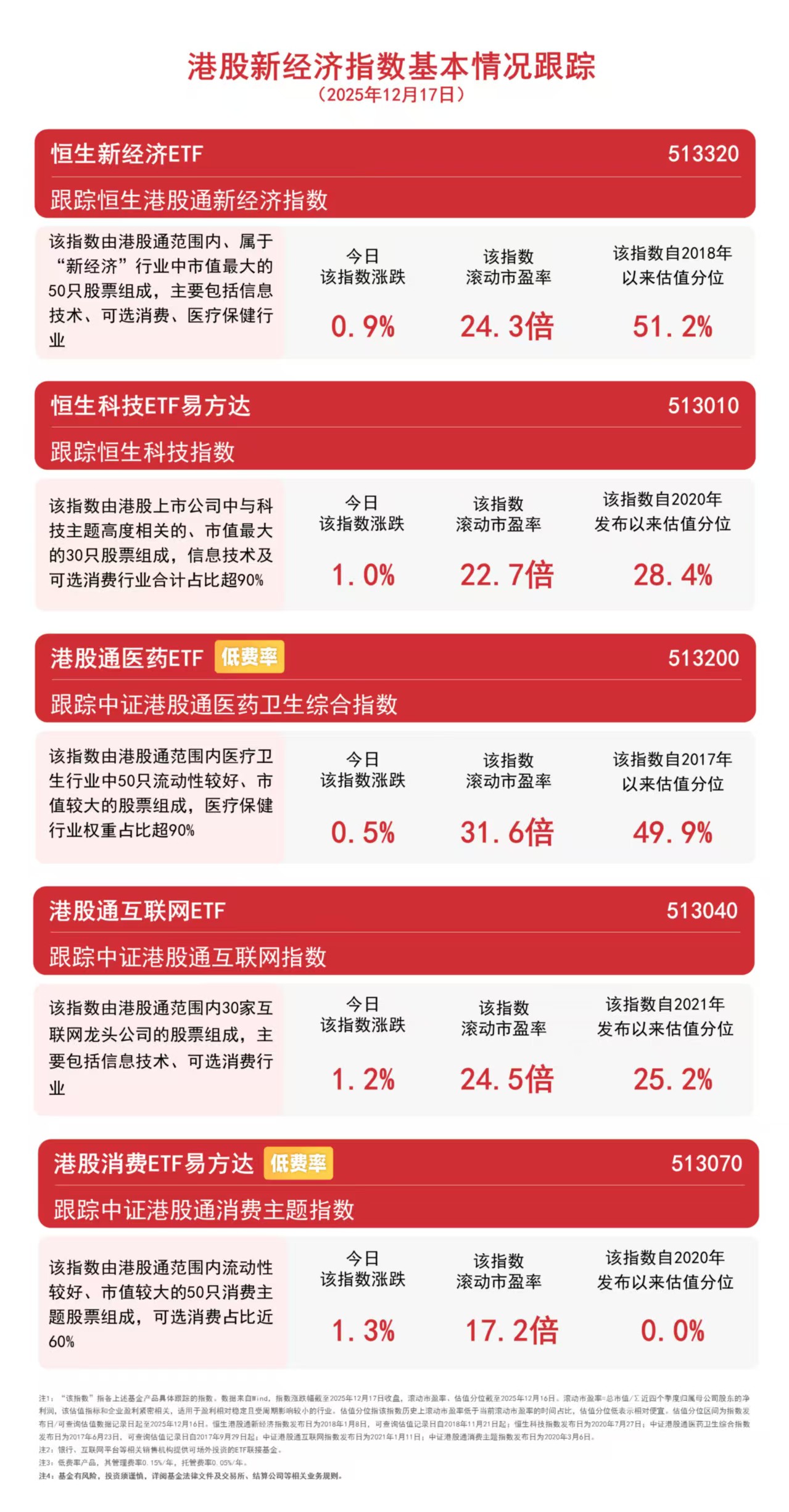 今日午后,港股震荡反弹,AI产业链与新消费股涨幅居前。截至收盘,中证港股通消费主题指数上涨1.3%,中证港股通互联网指数上涨1.2%,恒生科技指数上涨1.0%,恒生港股通新经济指数上涨0.9%,中证港股通医药卫生综合指数上涨0.5%。Wind数据显示,12月以来,恒生科技指数相关ETF合计“吸金”超80亿元,其中仅恒生科技ETF易方达(513010)一只产品净流入额就超过20亿元、居同类前列。