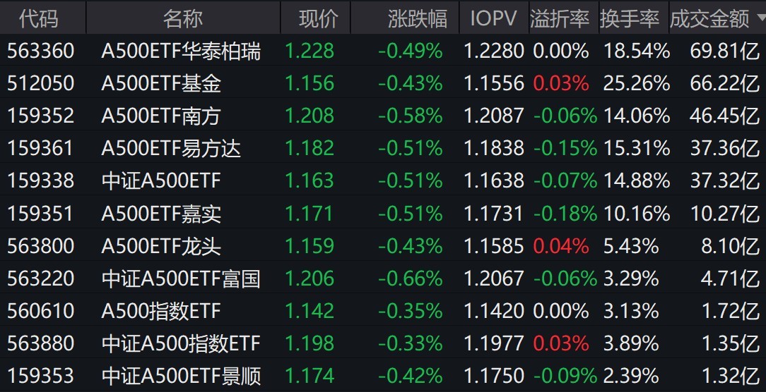 每经记者|叶峰 每经编辑|肖芮冬 三大指数涨跌不一,沪指拉升翻红,中证A500指数下跌0.44%。从板块来看,商业航天概念再度爆发,大消费板块走强,AI医疗概念震荡拉升;下跌方面,锂电池板块回落。 截至上午收盘,场内跟踪中证A500指数的ETF小幅下跌。其中,有11只中证A500相关ETF成交额超1亿元,3只超46亿元。A500ETF华泰柏瑞、A500ETF基金、A500ETF南方早盘成交额分别为69.81亿元、66.22亿元、46.45亿元。 有券商表示,上周A股市场在国内外诸多事件相继落地后呈现显著分化与震荡格局。美联储降息后市场对后续宽松节奏的预期出现波动。中长期看,支撑本轮A股上涨的基础并未发生转变。预计上证指数围绕4000点蓄势整固的可能性较大。