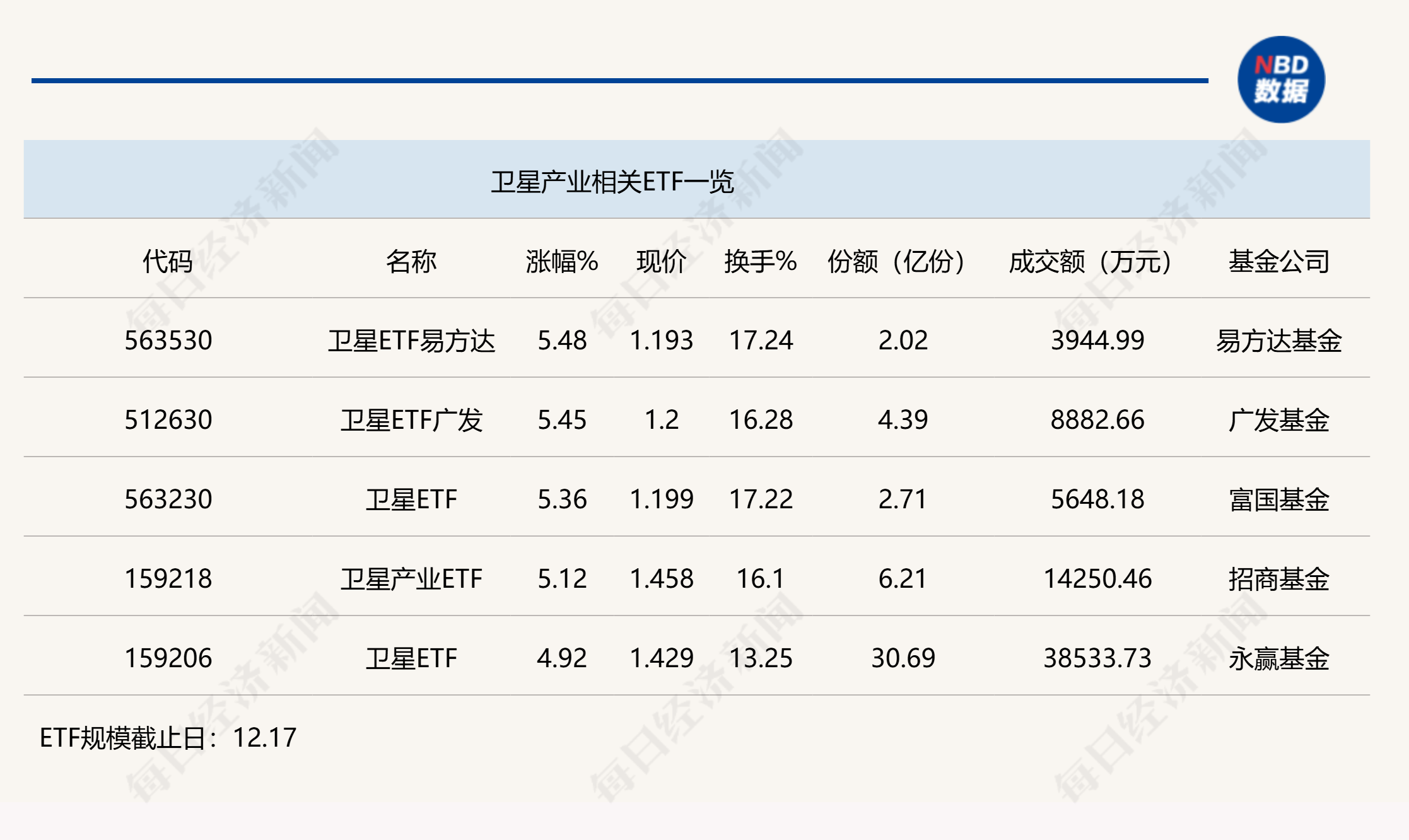 投资逻辑来看,低轨卫星星座已成为大国太空博弈的新赛道,在频轨资源争夺下,卫星产业市场空间剑指万亿。低轨卫星资源争夺倒逼下,卫星全产业链有望从“投入孵化期”提前步入“盈利兑现期”。因此,卫星产业是确定性较强的战略投资机会,具备市场规模潜力大、政策强力支持、技术迭代加速、应用场景拓宽等特征。目前,卫星产业正处于“政策支持+技术突破+应用拓宽”的三重拐点,是配置卫星产业的最佳时间点。 点评:卫星ETF易方达(563530)今日上午涨幅达到5.48%,其份额为2.02亿份,半日成交金额为3945万元,该ETF追踪的是中证卫星产业指数。追踪该指数的ETF还包括卫星ETF广发(512630)、卫星ETF(563230)等。 中证卫星产业指数选取50只业务涉及卫星制造、卫星发射、卫星通信、卫星导航、卫星遥感等领域的上市公司证券作为指数样本,反映卫星产业上市公司证券的整体表现。