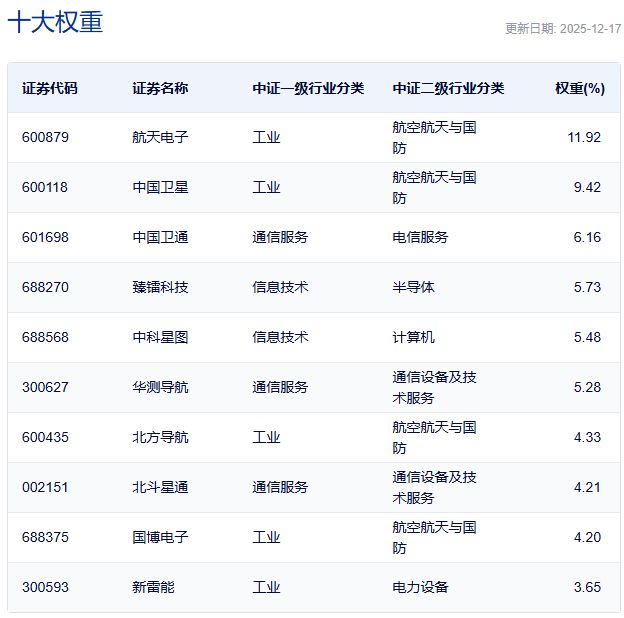 中证卫星产业指数主要权重股 封面图片来源:每日经济新闻 |