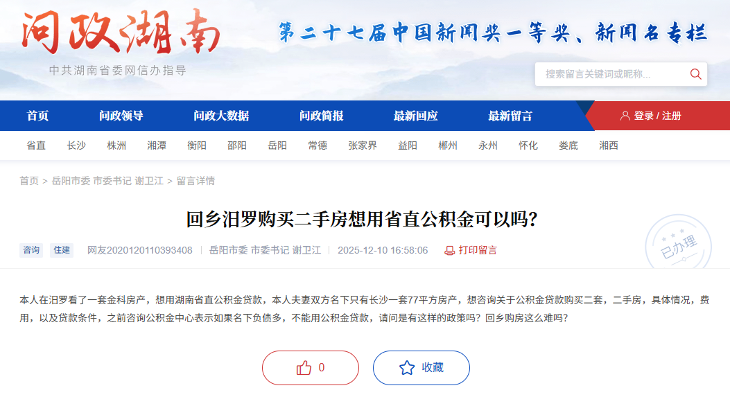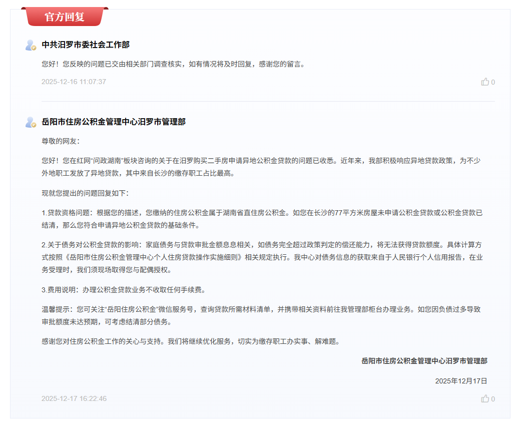 网友在《问政湖南》栏目上的发帖内容与官方回应。 红网时刻新闻12月18日讯(记者 陈星晓)近日,一名岳阳网友在红网《问政湖南》平台咨询,自己计划回乡在汨罗购买二手房,能否使用湖南省直公积金贷款,并希望了解贷款条件、费用等问题,引发关注。 网友表示,自己与配偶双方名下在长沙仅有一套77平方米的住房,目前看中汨罗一套二手房,希望使用省直公积金贷款,但此前咨询时曾被告知负债多可能无法使用公积金贷款,对此产生疑问:“回乡购房这么难吗?” 岳阳市住房公积金管理中心汨罗市管理部随后作出回应,表示近年来积极落实异地贷款政策,为许多外地职工办理了异地贷款,其中来自长沙的缴存职工占比最高。 针对网友疑问,管理部进一步作出详细解答: 一、贷款资格 若网友在长沙的房产未申请过公积金贷款或贷款已结清,即符合申请异地公积金贷款的基本条件。 二、债务对贷款的影响 家庭债务与贷款审批金额息息相关。若债务完全超出政策认定的还款能力范围,将无法获得贷款额度。具体计算方式按照《岳阳市住房公积金管理中心个人住房贷款操作实施细则》相关规定执行,债务信息以人民银行个人信用报告为准,办理时需现场授权获取。 三、费用问题 办理公积金贷款业务不收取任何手续费。 管理部同时提醒,可通过“岳阳住房公积金”微信服务号查询贷款材料清单,并携相关资料前往柜台办理。如因负债过多导致审批额度未达预期,可考虑结清部分债务。