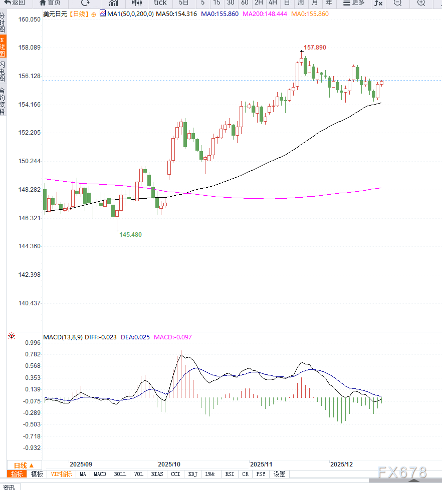 周四亚洲时段,日元维持横向整理,交易员在关键央行事件风险前选择观望。日本央行将于周五结束为期两天的政策会议,市场几乎一致预期其将加息至0.75%,创下近三十年来新高。 ![]() 与此同时,全球风险资产整体基调偏弱,提升了日元作为避险资产的吸引力,使得空头在当前阶段保持谨慎。 债券市场方面,受加息预期影响,日本短端国债遭遇抛售,10年期日本国债收益率升至2007年以来高位,日美利差收窄对日元构成结构性利好。 美元方面,尽管短线维持反弹,但受美联储政策前景偏鸽影响,上行空间有限。市场已开始计价2026年可能出现的两次降息,同时有关新一任美联储主席偏鸽的猜测,也抑制了美元中期做多意愿。 投资者同时等待即将公布的美国消费者通胀数据,以进一步判断美联储降息路径。 美元兑日元短线偏强但面临关键阻力 从技术面看,美元兑日元已向上突破100小时均线,小时图和日线振荡指标同步改善,显示短线动能偏多。 然而,156.00一线仍是关键阻力区域,需有效站稳该位置上方,才能确认新一轮上行行情。若突破成功,汇价有望依次测试156.60及157.00附近高点。 下方支撑方面,原100小时均线已转化为支撑,位于155.30附近,其次是155.00心理关口。若跌破该区域,技术性抛压可能增强,目标将指向154.30月内低点,进一步失守则不排除下探154.00整数位。 ![]() : 从当前环境来看,美元兑日元已进入“央行决策窗口期”。短线走势更多由事件驱动而非趋势推动,日本央行是否释放“持续加息”而非“一次性加息”的信号,将成为决定日元中期方向的核心因素。 若植田和男强调政策仍具灵活性、加息节奏取决于经济反馈,日元可能出现“利多兑现式回调”;反之,若释放明确紧缩延续信号,日元有望获得新一轮资金流入。