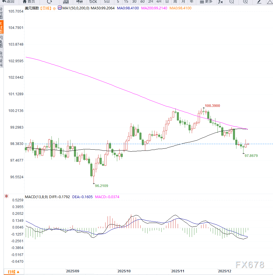 周四亚洲交易时段,美元指数在前一日小幅反弹后动能不足,整体围绕98整数关口下方窄幅波动,日内基本持平。 ![]() 在数据公布前,偏鸽的美联储预期令美元多头保持防御姿态。 基本面上,尽管美联储整体立场仍强调“谨慎行事”,但市场已经开始计价2026年仍可能出现两次降息。 这一预期建立在美国劳动力市场持续降温的背景之上,也削弱了美元的中期吸引力。 此外,围绕美联储主席人选的政治层面讨论,也在一定程度上加剧了市场对未来政策宽松的想象。 美国总统特朗普公开表示,希望下一任美联储主席更加支持大幅降息,这一表态强化了市场对政策前景偏鸽的解读。 不过,美联储理事沃勒的最新表态在一定程度上缓和了市场担忧。他强调将向总统重申央行独立性的重要性,这为美元提供了有限支撑。 但整体来看,这种支撑更多是情绪层面的修正,尚不足以扭转美元的基本面压力。 从技术结构看,美元指数此前反弹未能有效站稳200日简单移动平均线,并再次回落至该均线下方,强化了中短期偏空格局。 当前指数运行在98关口附近,整体仍处于下行通道内。 动能指标方面,日线振荡指标虽未进入极端超卖区,但仍处于偏弱区间,显示下行压力尚未完全释放。 在这一结构下,任何反弹更可能被视为技术性修复或逢高抛售机会,而非趋势反转。 若指数无法重新站上200日均线,后续仍存在回测前期低点的风险;只有在关键均线被有效收复后,美元指数的中期结构才有望得到修复。 ![]() : 综合来看,美元指数正处于“基本面偏空、技术面受压、事件驱动主导”的敏感阶段。在美国通胀数据落地前,市场缺乏明确方向,震荡整理是更可能的状态。 从中期逻辑看,劳动力市场降温与政策预期偏鸽仍是美元的主要掣肘因素。即便短线出现反弹,其性质也更偏向修正而非趋势性走强。若通胀未明显反弹,美元面临的结构性压力仍将延续,后续走势更需警惕“反弹乏力后再度走弱”的风险。