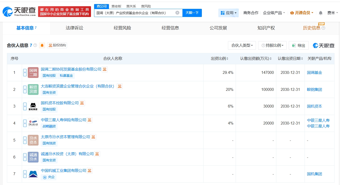 每经AI快讯,天眼查App显示,近日,国调(太原)产业投资基金合伙企业(有限合伙)成立,执行事务合伙人为诚通汾水投资(太原)有限公司,出资额50亿元人民币,经营范围为以私募基金从事股权投资、投资管理、资产管理等活动,由国调二期协同发展基金股份有限公司、鞍钢集团旗下大连鞍资滨盛企业管理合伙企业(有限合伙)、国机资本控股有限公司等共同出资。据媒体报道,该基金将立足太原市新兴产业发展现状,聚焦电子信息制造、新材料、新能源等六大核心产业,推动央企在晋项目,支持相关产业链初创企业成长。 ![]() ![]() |