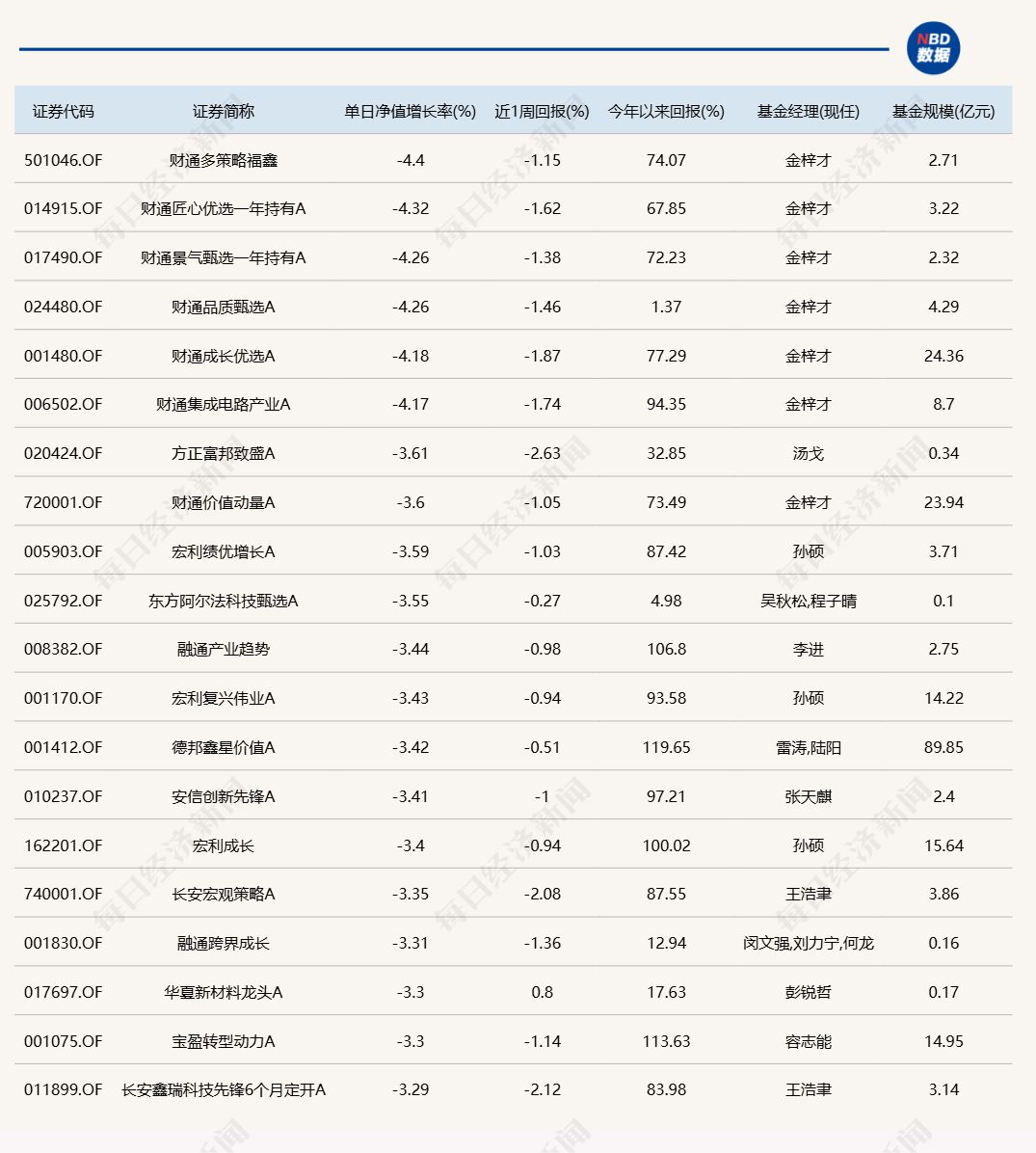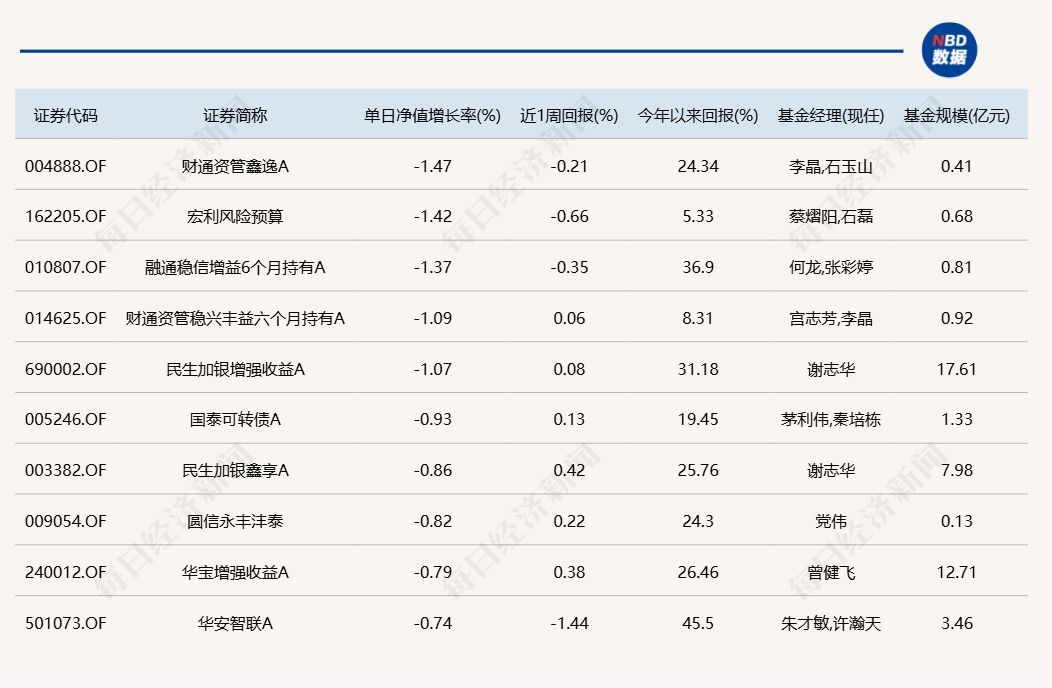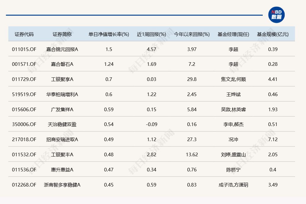 每经记者|肖芮冬 每经编辑|赵云 12月18日,三大指数涨跌不一,沪指低开回升,创业板指低开低走跌超2%。板块方面,医药商业、银行、零售等板块涨幅居前,电池、电网设备等板块跌幅居前。全市场近2900只个股上涨。沪深两市成交额1.66万亿元,较上一个交易日缩量1557亿。 下面一起来看今天公募基金的表现。 (注:榜单1、榜单2仅选取灵活配置型、偏股混合型和普通股票型三类产品作为主动基金的代表,纳入统计;债基相关榜单包括各类主、被动债券型基金) 1.单日涨幅榜