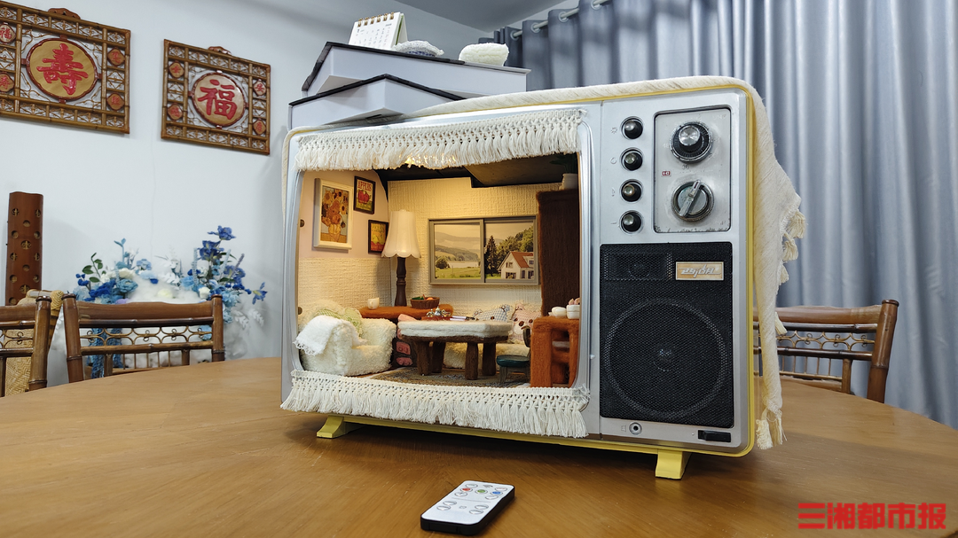 屈鑫宇用旧电视打造的“时光机”。受访者供图 灵感溯源,旧物件里的童年情结 “老师说可以在旧物件上做新改造,瞬间让我想起了爷爷奶奶家的旧电视机。”屈鑫宇介绍,这个创意始于11月初的课堂启发。在她的童年记忆里,爷爷奶奶家的老式电视机是童年快乐的源泉,见证了放学后的欢乐时光与家庭团聚的温馨。 “想把这些转瞬即逝的回忆永久留存下来。 ”确定创意后,屈鑫宇在网上搜寻合适的旧电视机,选中了一台款式贴合童年记忆的老式机型。“而拆解过程远比想象中复杂,电视机内部有很多细碎零件,既要彻底清理干净,又不能破坏外壳的整体结构,光是拆件和打磨就花了近一周时间。”屈鑫宇坦言,其间曾因担心损坏外壳多次暂停操作,最终在耐心摸索中完成了基础改造。 时光魔法,将记忆“锁”在旧电视里 拆解改造完成后,屈鑫宇投入到羊毛毡摆件的制作中。为还原童年场景的真实感,她参照记忆中爷爷奶奶家的布局,制作了桌椅、摆件、墙面装饰等微型道具。 “羊毛毡塑形需要极大的耐心,每一个小物件都要经过反复戳压、塑形、修剪,一个小小的桌椅就要花费两到三天时间。”屈鑫宇介绍,制作过程中,常常会因为细节不够贴合记忆而推倒重来,只为呈现最熟悉的“家的感觉”。 为让作品更具沉浸感,屈鑫宇特意加装了可遥控的灯光装置。“按下开关,灯光慢慢亮起,就像小时候打开电视机一样,瞬间就能把我拉回童年时光。”灯光亮起,羊毛毡制作的温馨场景在柔光中更显灵动,仿佛穿越回儿时放学后围坐在电视机前的日子。 “旧物件本身就带着时光的温度,通过创意改造赋予它们新的生命,既能留存回忆,又能传递温暖。”屈鑫宇希望未来能尝试更多类型的老物件改造,通过作品唤醒心中的美好记忆。 |