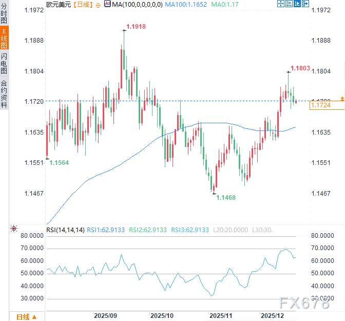 欧元兑美元周五(12月19日)于1.1720附近震荡,因此前大西洋两岸密集发布的经济数据未能为单一货币提供明确方向。 ![]() 美国劳工统计局公布的延迟数据显示,11月整体通胀与核心通胀率均降至2021年初以来最低水平。尽管这为进一步宽松政策打开了空间,但上周失业救济申领人数改善且超出经济学家预期的双重压力正在逼近。 在大西洋彼岸的布鲁塞尔,欧洲央行如预期维持利率不变。消息人士称,降息周期“大概率已经结束”。欧洲央行行长拉加德表示该决议获得一致通过,欧洲央行将继续坚持“逐次会议决策”的方针。 数据公布及欧洲央行决议后,周四欧元兑美元跌幅0.16%,仍处在熟悉区间内。 交易员的关注点已转向美联储青睐的通胀指标——核心个人消费支出价格指数(PCE),以及密歇根大学消费者信心指数终值的发布。 欧洲方面,市场将密切关注欧洲央行官员马里奥·奇波洛内、马丁·科赫尔的讲话,以及10月经常账户数据。 流动性稀薄致欧元走势停滞 美国劳工统计局数据显示,11月通胀进一步降温,消费者价格指数同比上涨2.7%,较9月的3.0%有所放缓,且低于市场预期的3.1%。剔除食品和能源的核心通胀率同比增幅从3.0%降至2.6%,强化了通胀回落趋势重启的信号。 与此同时,美国劳工部数据显示,申领失业救济人数有所下降。截至12月13日当周,初请失业金人数增至22.4万人,较下修后的前值23.7万人减少,且低于22.5万人的预期值。 根据Capital Edge利率概率数据,市场对美联储在明年1月28日下次会议降息的预期仍保持24%不变。然而对于整个明年,投资者已定价60个基点的降息幅度,首次降息预计在明年6月。 芝加哥联储主席奥斯坦·古尔斯比表示通胀数据“令人鼓舞”,“对通胀下降态势更清晰的认知”可能促使利率进一步下调。但他仍保持轻度鹰派立场,称对“过早降息感到不安”。 欧洲央行连续第四次会议维持利率不变,存款机制利率保持在2.00%,主要再融资利率维持在2.15%,边际贷款工具利率为2.40%,符合市场预期。 技术展望:欧元/美元在保持看涨态势下陷于震荡 欧元/美元连续第六个交易日在1.1700-1.1800区间横盘整理,随着交易者为圣诞假期做准备,价格走势趋于平缓,流动性逐渐枯竭。 相对强弱指数(RSI)显示动能仍偏向多头,但在低成交量交易中已趋于平缓。 上行方面,若想延续看涨走势,汇价需突破1.1750阻力位并站上1.1800关口。一旦突破后者,将有望测试1.1850及年内高点1.1918。 下行方面,若欧元/美元进一步走弱并跌破1.1700,则可能下探100日简单移动平均线(SMA,1.1652),继而下探1.1600关口。 ![]() 北京时间10:15,欧元兑美元交投于1.1726/27。