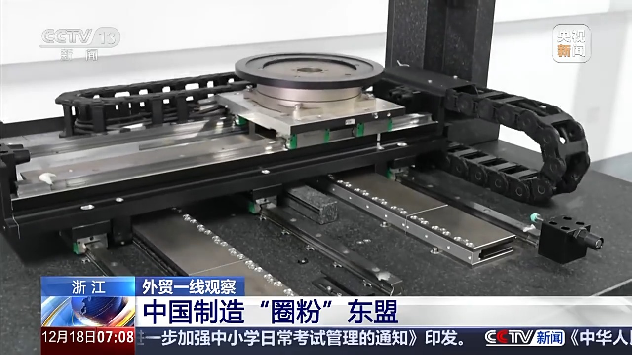 宁波的一家机器人加工车间,工人们正加紧生产发往马来西亚的半导体晶圆检测仪。这款产品凭借高精度、小体积的核心优势,在东盟市场颇受青睐。 宁波某外贸企业负责人 陈羽笈:目前它的重复定位精度已经达到了300纳米的级别,它也是出口东盟各国当中处于竞争力非常强大的产品。