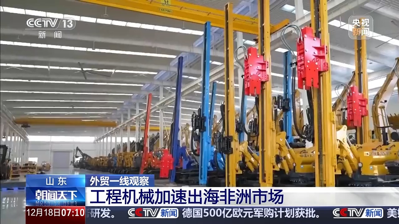 宁波海关所属鄞州海关查检一科副科长 孙向磊:我们通过全天候预约通关服务,持续跟踪国际标准动态和进口国技术要求,提升企业产品合规出口能力,为企业打造通关“绿色通道”,提升国际竞争力 。 工程机械加速出海非洲市场 在共建“一带一路”倡议与中非合作深化的大背景下,我国与非洲贸易发展迅速。随着非洲国家基础设施建设的增加,非洲市场对基建材料、工程机械等需求不断提升。我国企业抢抓机遇,努力拓展非洲市场。今年前11个月,我国与非洲进出口2.25万亿元,同比大幅增长18.7%,成为我国外贸多元化布局中的亮眼增长点。 近日,山东济宁的一批凿井机械即将装车从青岛港运往非洲的尼日利亚。