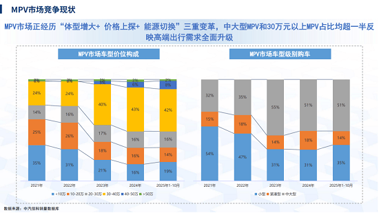 CCRT评价体系最核心的原则,是贯穿始终的“双重验证”。该体系涵盖驾驶性能、舒适性、造型与品质、安全性能、用车成本及智能网联六大二级指标,下设21个三级指标,并进一步细化为72个四级指标。这意味着,对一辆车的评价不仅包含百公里加速、续航里程等硬数据,更全面覆盖了转向操控精准度、隔音降噪性能、智能语音交互成功率等与日常用车体验息息相关的软性指标。 本期评测主要关注新能源MPV市场,则是源于CCRT洞察到MPV市场已从边缘细分市场,稳步演变为承载技术突破、品牌升级与家庭消费迭代的核心战场。CCRT发布《新能源MPV市场洞察报告》指出,中大型MPV在市场中的占比已经过半,30万元以上的高端市场更是呈现出持续扩张的强劲态势。
