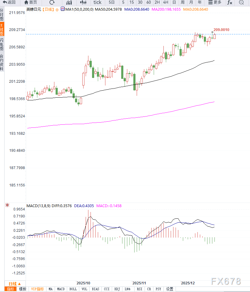 周五亚洲交易时段,GBP/JPY在208.70附近小幅反弹,延续此前的强劲涨势。此前汇价自209.00上方高位回调,但在亚洲盘遇到逢低买盘支撑,维持盘整震荡。 ![]() 相比之下,英镑受益于英国央行近期的政策决定。BoE以5:4票数投票决定降息25个基点至3.75%,但投票接近,显示委员会内部对未来政策分歧明显。 市场由此下调对明年激进宽松的预期,给英镑提供支撑,推动GBP/JPY交叉盘维持高位震荡。 尽管BoE仍有可能在明年进一步降息,这与BoJ的偏鹰立场形成显著政策分歧,使日本与其他主要经济体的利差收窄,从而限制GBP/JPY的进一步上涨空间。 此外,全球风险偏好回升也削弱了日元避险支撑,但汇价仍在高位稳健整理,短期多头优势依然存在。 从日线图来看,GBP/JPY自209.00高位回调后形成短期震荡格局。汇价维持在20日和50日移动均线之上,显示多头趋势仍在,但上方存在前期高点及心理关口阻力。 RSI在中高区间,未出现超买信号,暗示短线仍有温和上行空间,但需留意多头动能是否延续。若有效突破209.00,汇价有望测试210.00心理关口;若跌破208.00支撑,则可能回调至207.30-207.50区域,短线震荡风险增加。 ![]() GBP/JPY短期仍以高位震荡为主,BOJ偏鹰加息与BOE谨慎降息形成政策分歧,为汇价提供一定支撑但限制进一步上行。关注BOJ行长发言及全球风险偏好变化。