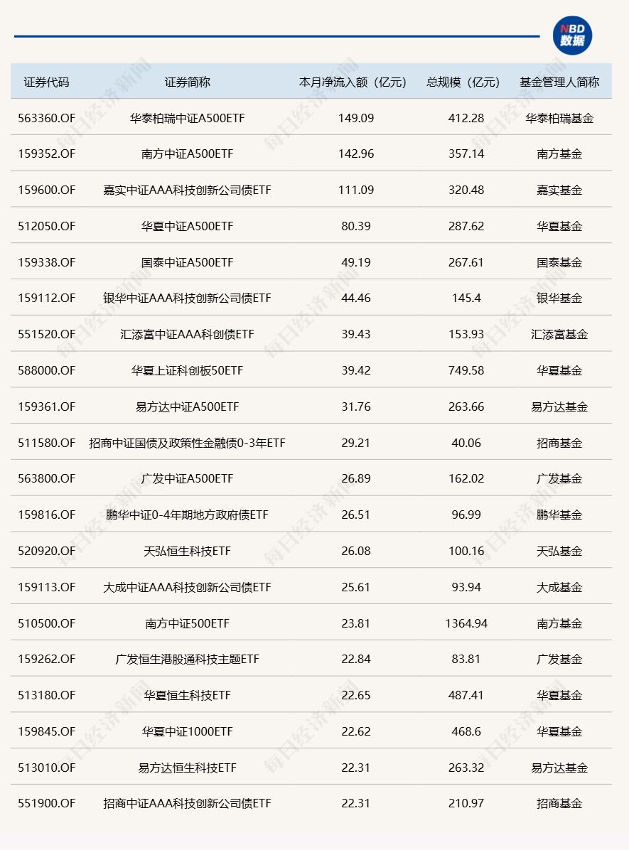 每经记者|赵云 每经编辑|肖芮冬 上周五,沪指震荡回升,创业板指冲高回落。板块方面,海南、乳业、零售等板块涨幅居前,贵金属、半导体等板块跌幅居前。 Wind数据显示,在12月19日的非货币ETF市场中,招商中证AAA科技创新公司债ETF基金份额增加0.21亿份,净流入额20.66亿元;南方中证A500ETF份额增加16.83亿份,净流入额20.43亿元;易方达中证A500ETF份额增加14.31亿份,净流入额17.01亿元。