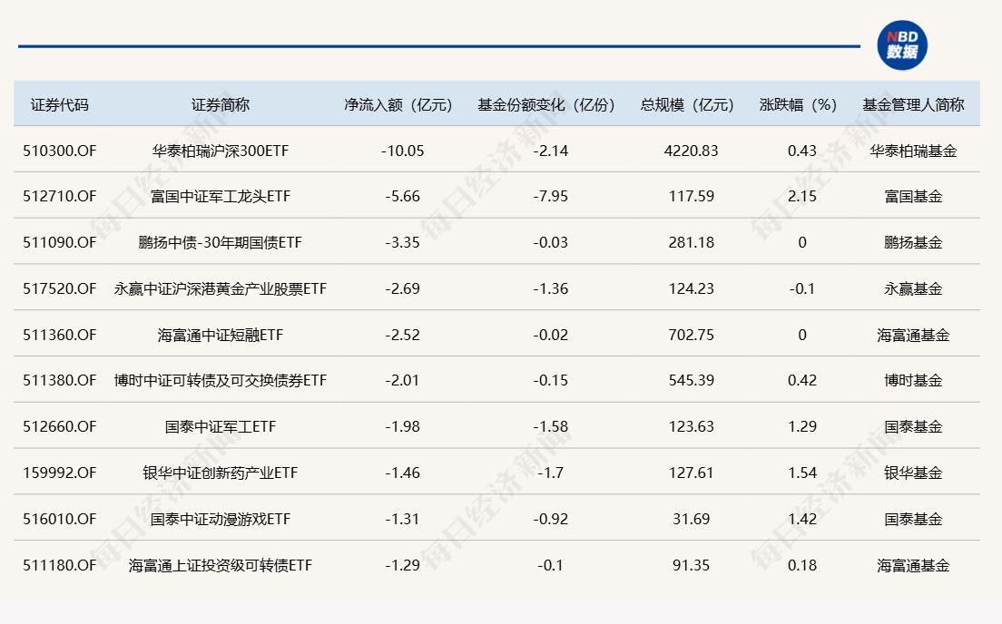 与此同时,华泰柏瑞沪深300ETF基金份额减少2.14亿份,净流出额10.05亿元;富国中证军工龙头ETF份额减少7.95亿份,净流出额5.66亿元;鹏扬中债-30年期国债ETF份额减少0.03亿份,净流出额3.35亿元。 截至12月19日,本月资金净流入额居前20的ETF名单如下: