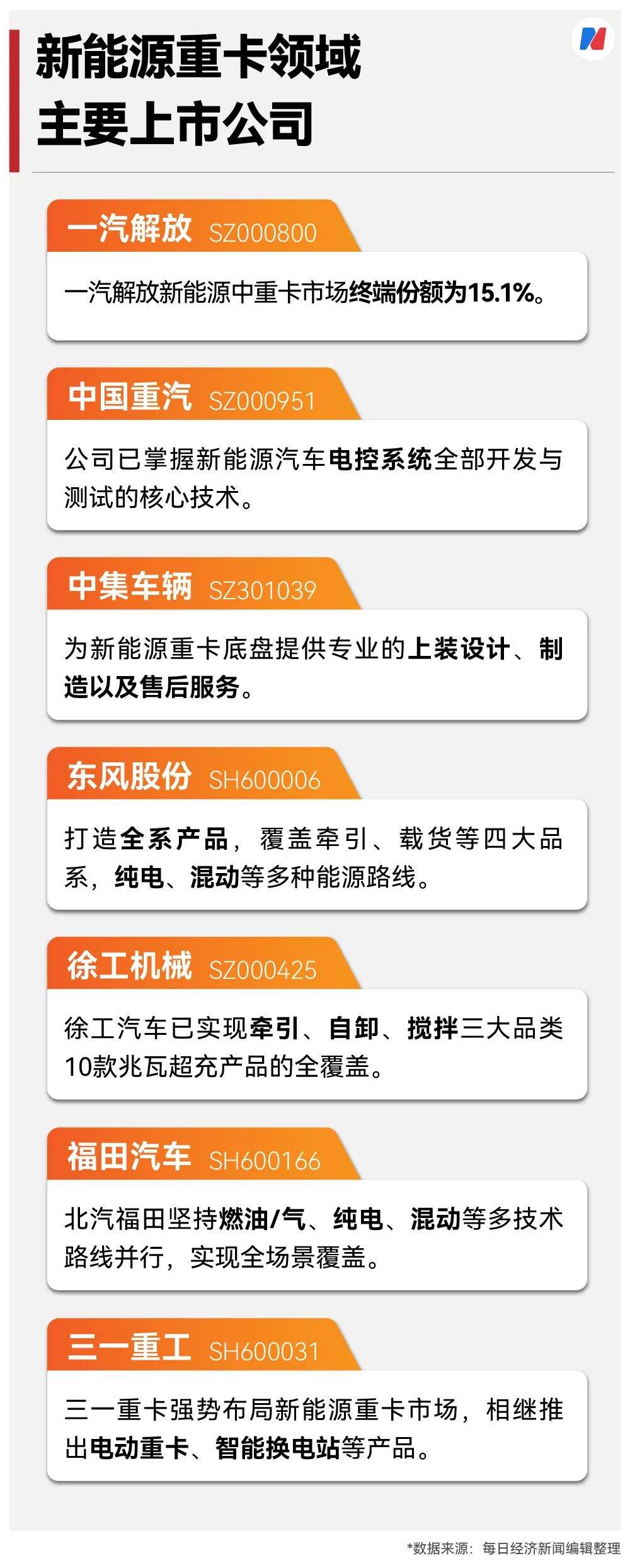 多位业内人士向每经记者分析,新能源重卡销量快速提升,主要是因为自然置换的刚性需求、“以旧换新”补贴政策、产品经济性提升等多重利好叠加。 每经记者梳理发现,今年的补贴政策源于3月。交通运输部、国家发展改革委和财政部印发《关于实施老旧营运货车报废更新的通知》,将国三、国四排放标准的营运货车纳入补贴范围。车主提前报废重型货车最高补贴4.5万元,更新为新能源重型货车最高补贴9.5万元,二者叠加每辆车最高可获得14万元的补贴。 “如果一辆新能源重卡售价约60万元,若能拿满14万元补贴,相当于七七折优惠。”陈珂向每经记者算了一笔补贴账。 他透露,当前置换需求高的多为组织型客户,这类客户以批量采购为主,单个订单规模在20辆至50辆,资金体量相当大。这种力度的补贴对其降成本确实很有吸引力。 除了政策补贴的拉动,新能源重卡的营运成本优势也是销量上涨的重要因素。 相较于传统重卡,新能源重卡的能源成本仅为前者的20%~30%,这一核心优势在400公里以内的中短途货运市场尤为凸显。 陈珂坦言,近年来国内货运行业竞争日趋激烈,新能源重卡的营运成本低于传统重卡,能进一步拉低货运成本,让企业更容易低价中标。这也是组织型客户相较于散户更具置换动力的关键。 “重卡是生产资料,所以用户对于TCO(Total Cost of Ownership,全生命周期成本)是极其关注的。”彭佩敏进一步表示。