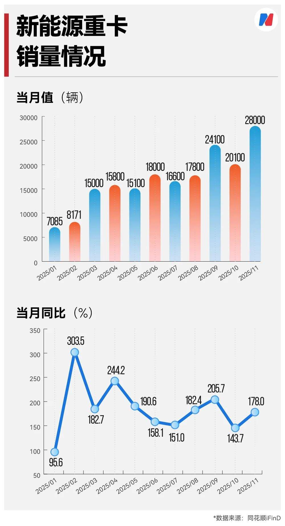 “现在订单供不应求,客人直接到工厂催单,这在以往难得一见。”谈及今年的销量,中国重汽(000951)的一位销售负责人陈珂(化名)喜形于色。 数据也证实了这一点。中汽协最新数据显示,11月我国重型货车销量11.3万辆,同比增长65.4%,实现八连涨。 在本次销售热潮中,新能源重卡成为新引擎。 公开数据显示,11月份,国内新能源重卡市场共计销售2.8万辆,同比增长178%,前三季度销量同比增长184%。 为何重卡销量上涨如此明显?本轮行情的“主角”为什么是新能源重卡?围绕这些问题,《每日经济新闻》记者(以下简称每经记者)进行了深入调查。 1 订单太多、产能不足,客户直接去厂里催单 “订单太多,但产能供不上,我们只能优先保障核心客户的需求。”陈珂清楚地记得,这场重卡市场的变局始于去年。 他告诉每经记者:“从2024年10月到现在,我们就没闲过。原先的一班制生产满足不了需求,部分地区生产车间已经改成两班制。” 中国重汽旗下的一家齿轮公司上演着同样的景象。在大月生产压力下,该公司提高产能,变速箱总成装机量同比增长66%,总成单班产量超610台。 车间的热火朝天也直接反映在企业销量上。第一商用车网数据显示,11月,中国重汽销售各类重卡2.5万辆,同比增长23%;一汽解放重卡销量同比大增近八成;东风公司重卡销量同比大增近七成;徐工、北汽福田重卡销量同比上涨约1.5倍。