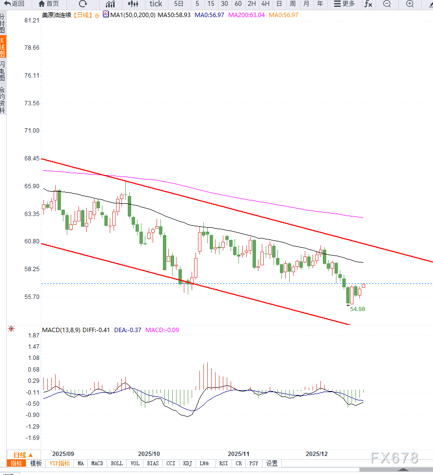 周一亚洲交易时段初期,国际油价出现温和上涨,交投于56.95美元/桶附近。市场消息显示,美国近期对涉及委内瑞拉原油出口的运输活动采取了更为严格的执法措施,这一动态成为支撑油价的重要因素之一。 ![]() 因此,资金更多采取短线参与策略,而非大规模布局。 部分能源市场分析人士指出,若相关执法行动持续,可能在心理层面对市场形成支撑,但对全球原油供需格局的实质性影响仍需进一步观察。 从日线图形来看,美原油(WTI)整体仍处于弱势震荡格局之中。价格目前运行在前期低位区域附近,56美元一线构成短期重要支撑位,若有效跌破,不排除测试前低的风险; 上方来看,58.00—58.50美元区域对应日线短期均线与前期密集成交区,对油价形成明显压制。 技术指标方面,日线MACD仍位于零轴下方,绿柱虽有收敛迹象,但尚未出现金叉,显示反弹动能有限;RSI指标徘徊在40—45区间,表明市场情绪偏弱但已逐步脱离超卖状态。 综合判断,在基本面消息扰动下,油价存在技术性反弹空间,但在趋势未明显扭转前,日线级别仍以低位震荡、反弹受限的结构看待。 ![]() 整体来看,此轮油价反弹更多是由消息面驱动的阶段性修复,而非基本面全面改善的结果。在需求端缺乏明确利好之前,单一供应风险难以推动油价持续走强。 短期内,油价或将维持区间震荡格局,市场关注重点仍将集中在政策执行力度及其对实际出口规模的影响上。
