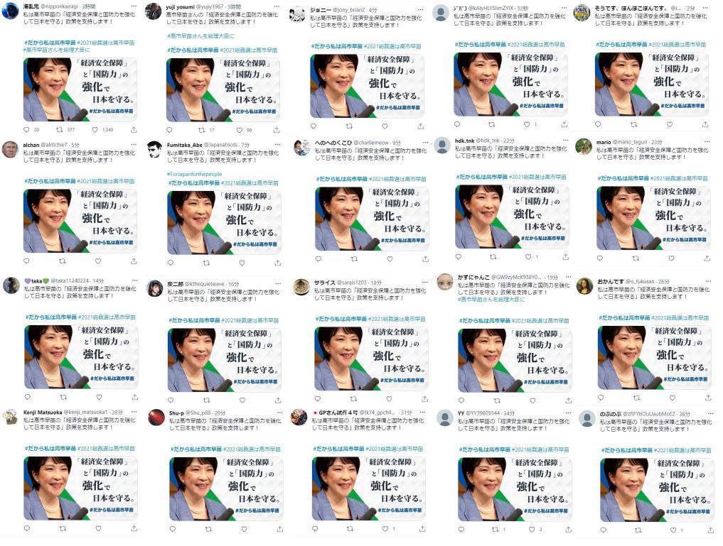 日本网民分享的图片显示,有大量不同账号发表了支持高市的相似帖文,文字内容几乎一模一样,图片也是用的同一张宣传海报。 |