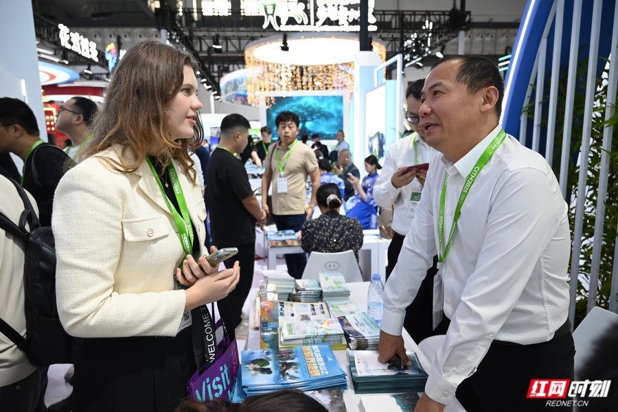 外国旅行商在张家界展台前咨询。 湖南星之旅国际旅行社副总经理丁石彪表示:“得益于入境免签政策优化及持续国际推广,目前面向欧美市场的线路中,含张家界的产品占比显著提升。”展台现场,奥地利、新西兰、俄罗斯、泰国、肯尼亚等多国买家咨询洽谈踊跃。 展会期间,湖南省文化和旅游厅主动出击,密集开展专场推介与精准对接,联合中国驻莫斯科旅游办举办俄语系国家旅行商洽谈会,拜会主要客源地驻外机构负责人,为旅游企业直接链接国际资源。