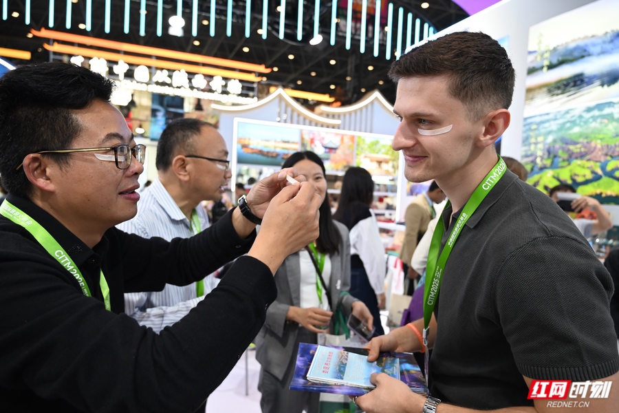 来自奥地利的旅行商在体验新晃龙脑眼贴。 湖南展区位于4号馆,以“三湘四水,相约湖南”为主题,设计融合山水意境与现代美学,现场人流如织。展区不仅以高清影像等形式呈现张家界、凤凰古城等绝美风光,更通过动态文化展演传递鲜活湖湘魅力。旅游产品推介与经典花鼓戏《刘海砍樵》、悠扬湖南民歌等非遗表演轮番登场,吸引了众多国际旅行商驻足沉浸、拍照互动。 展区现场交流洽谈热烈,消费体验氛围浓厚。常德米粉展位前排起长队,现煮米粉香气扑鼻,当天卖出数百余份;怀化展台的趣味抽奖,长沙、岳阳、益阳、株洲、娄底等城市集展示、品鉴、体验于一体的综合呈现——品安化黑茶、赏醴陵陶瓷、购新晃龙脑、了解浏阳烟花,让展台始终人气高涨,生动诠释了湖南文旅产业的多元融合与创新活力。