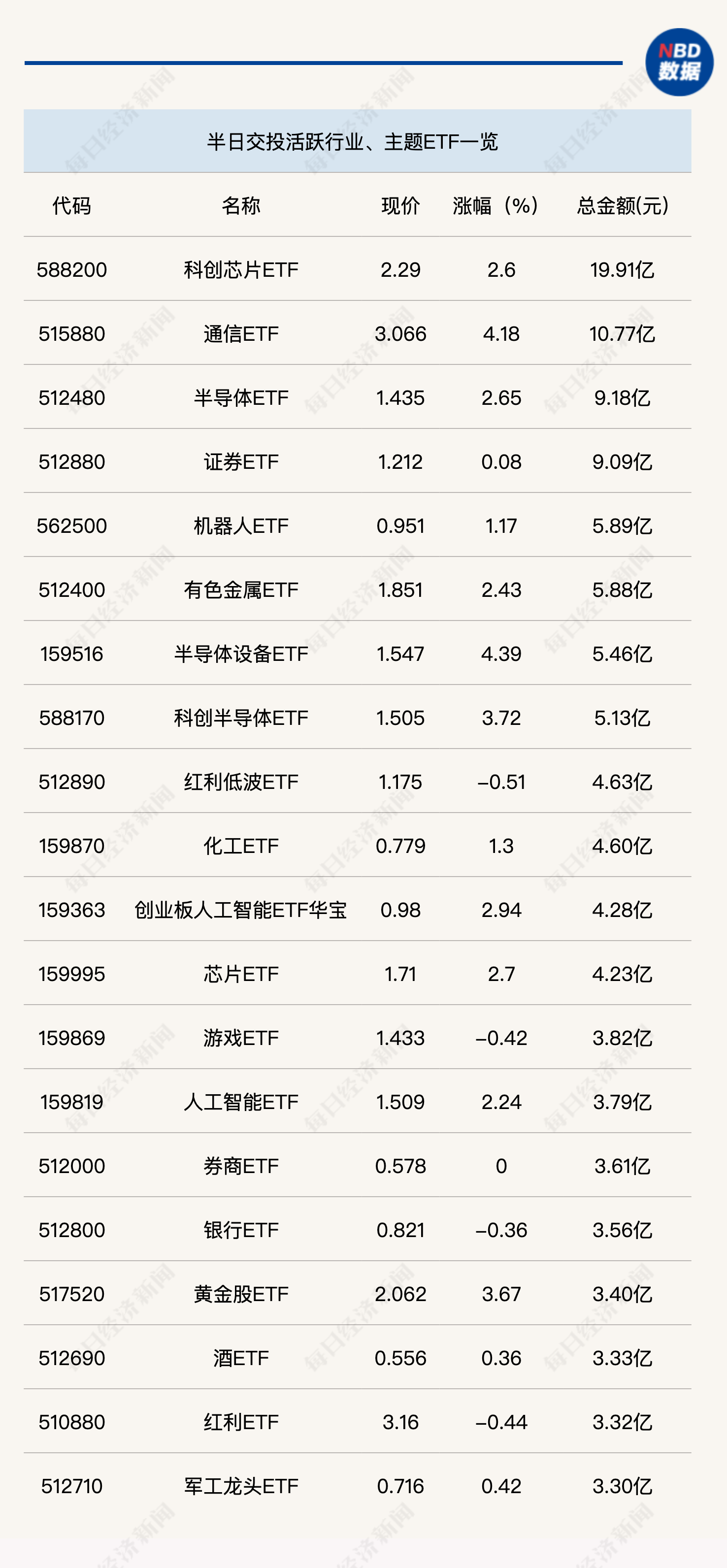 0每经记者|刘明涛 每经编辑|肖芮冬 今日上午,科创芯片ETF(588200)交投相对活跃,半日成交金额近20亿元;通信ETF(515880)显著放量,半日成交金额达到10.77亿元。跨境ETF方面,香港证券ETF(5 ...