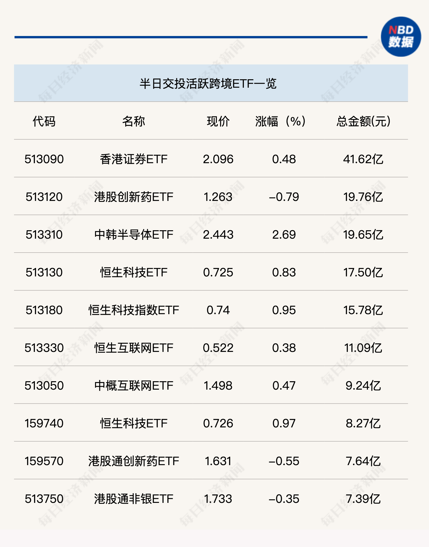 每经记者|刘明涛 每经编辑|肖芮冬 今日上午,科创芯片ETF(588200)交投相对活跃,半日成交金额近20亿元;通信ETF(515880)显著放量,半日成交金额达到10.77亿元。跨境ETF方面,香港证券ETF(513090)半日成交金额为41.62亿元,成交金额相对较大。