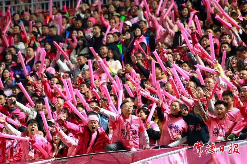 常德球迷助威团呐喊助威。 下半场双方攻势全面升级,攻防转换节奏进一步加快。株洲队持续加强进攻火力,连续组织多人配合冲击常德队禁区,均被其拒之门外。常德队快速反击予以回应,双方的激烈争夺让现场气氛持续升温,却始终未能打破僵局,常规时间以0:0结束。