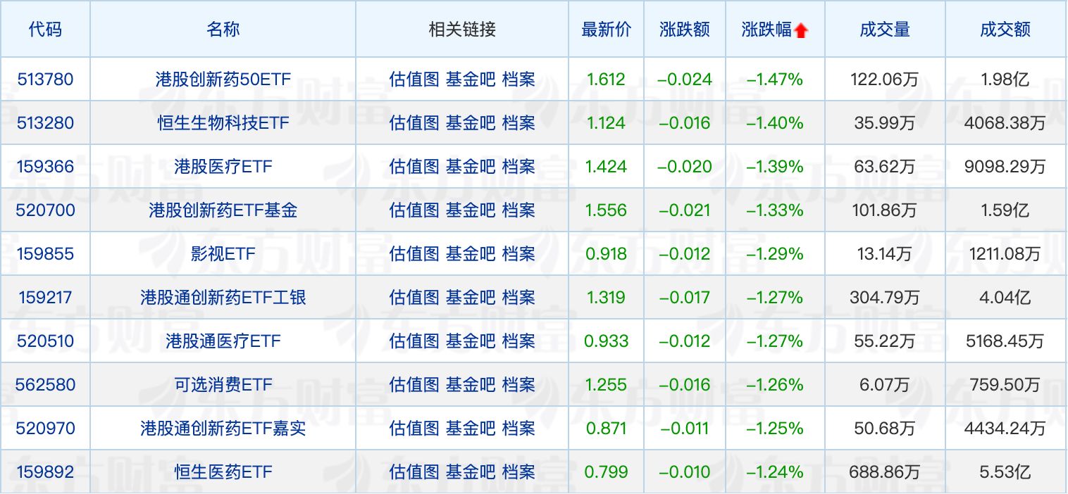 下跌方面,港股创新药相关ETF领跌1.47%。