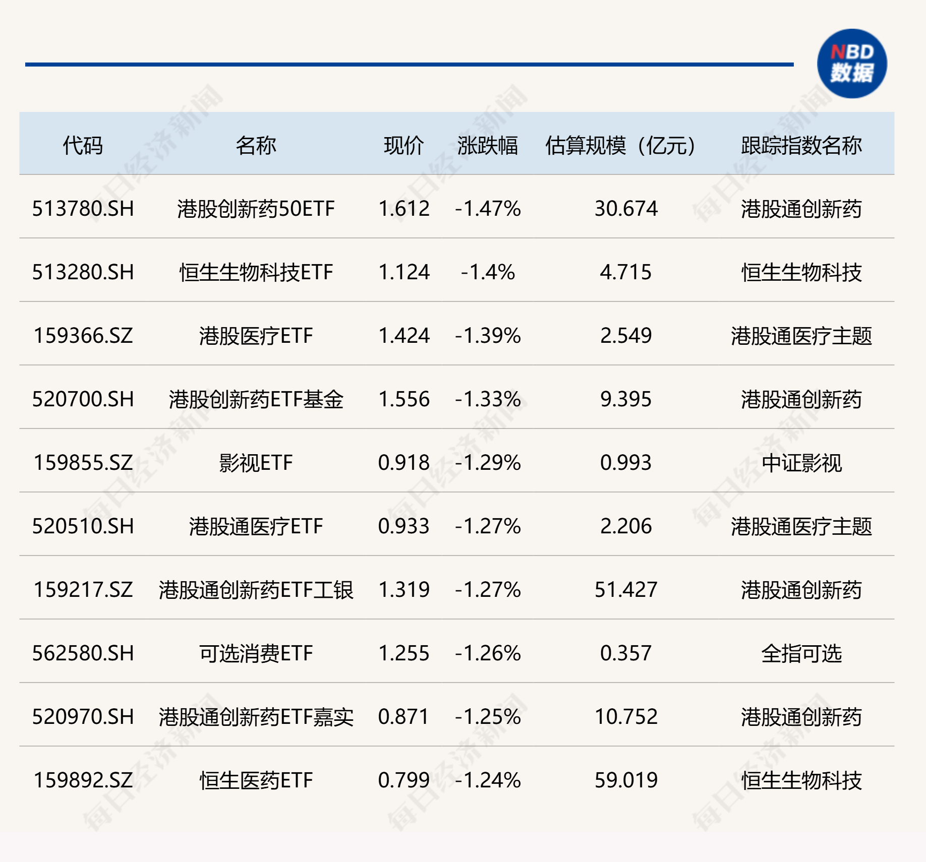 有分析表示,在AI浪潮和国产化大背景下,国内先进产线未来扩产需求持续存在,半导体设备作为晶圆代工扩张的基石,同时是实现产业链自主可控的重要环节,国产半导体设备企业有望迎来发展机遇。 下跌方面,港股创新药相关ETF跌幅居前。