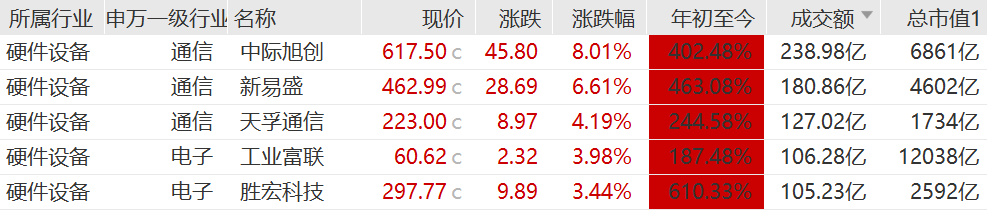 012月22日,市场情绪回暖,A股硬件设备方向再度爆发,中际旭创、新易盛、天孚通信、工业富联、胜宏科技等AI硬件巨头全天成交额占据全市场TOP5。年初至今,中际旭创、新易盛股价累计涨幅超400%,胜宏科技累计涨幅超600 ...