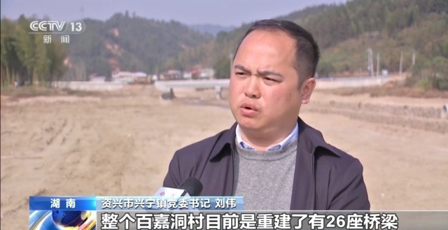 资兴市兴宁镇党委书记 刘伟:这一年以来,我们主要围绕在基础设施恢复和群众的避险搬迁这两个方面在开展工作。整个百嘉洞村目前是重建了有26座桥梁。关于道路的修复,现在目前是总共修复了36公里。针对恢复的1000多亩农田里面有260亩左右作为今年开展高标准农田改造的对象。