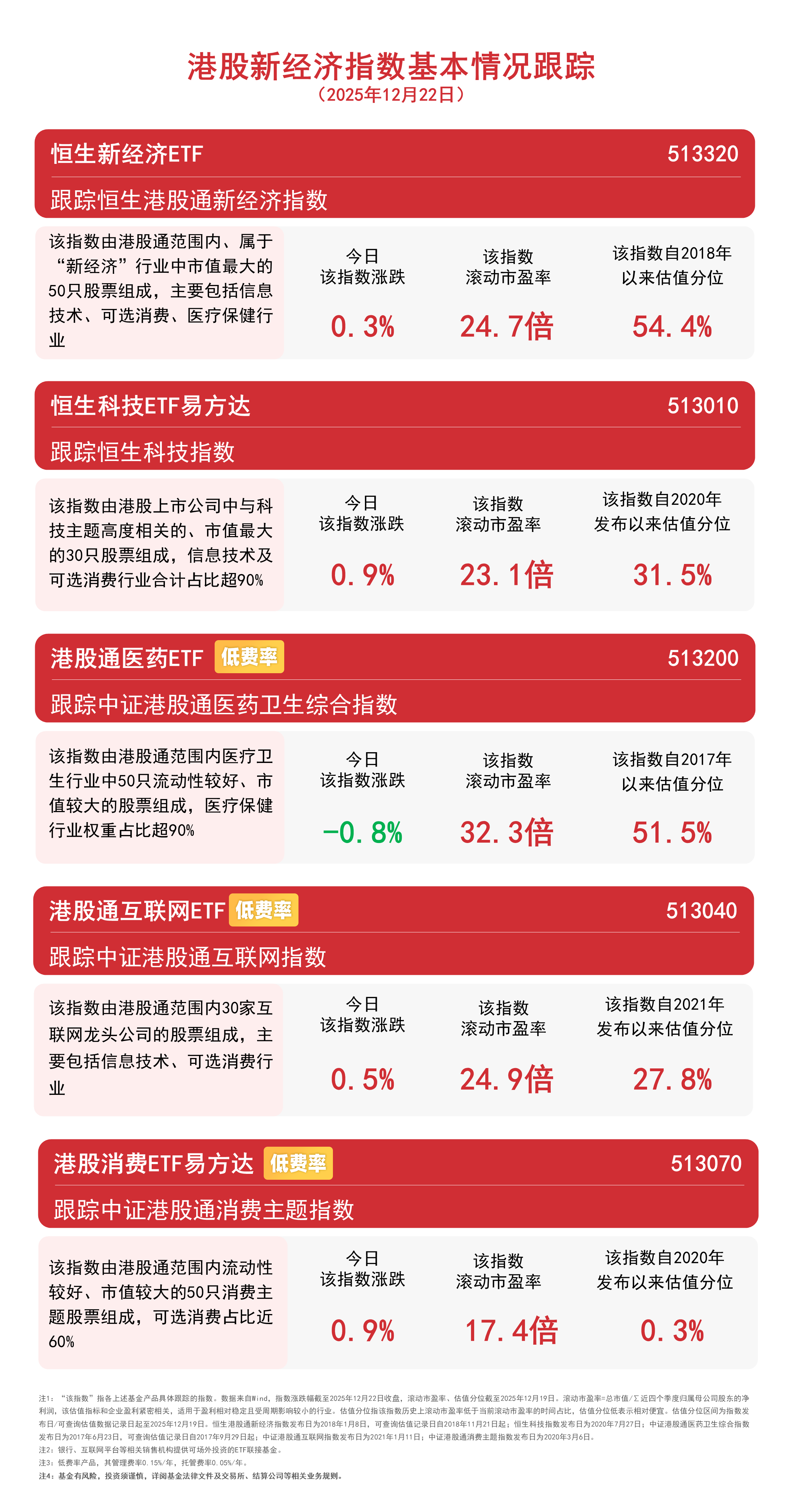 港股今日震荡分化,半导体、有色金属、消费等板块活跃,医药板块回调。截至收盘,恒生科技指数、中证港股通消费主题指数均上涨0.9%,中证港股通互联网指数上涨0.5%,恒生港股通新经济指数上涨0.3%,中证港股通医药卫生综合指数下跌0.8%。资金持续布局,Wind数据显示,恒生科技ETF易方达(513010)和港股通互联网ETF(513040)上周分别获9.2亿元和2.8亿元资金净流入。 中信证券表示,“十五五”规划建议强调建设现代化产业体系、加快高水平科技自立自强,新能源、新材料、航空航天等战略性新兴产业集群和量子科技等未来产业或迎来新的政策支持。展望2026年,港股有望受益于内部的“十五五”催化,建议投资者把握AI相关细分赛道、消费电子等科技方向投资机遇。