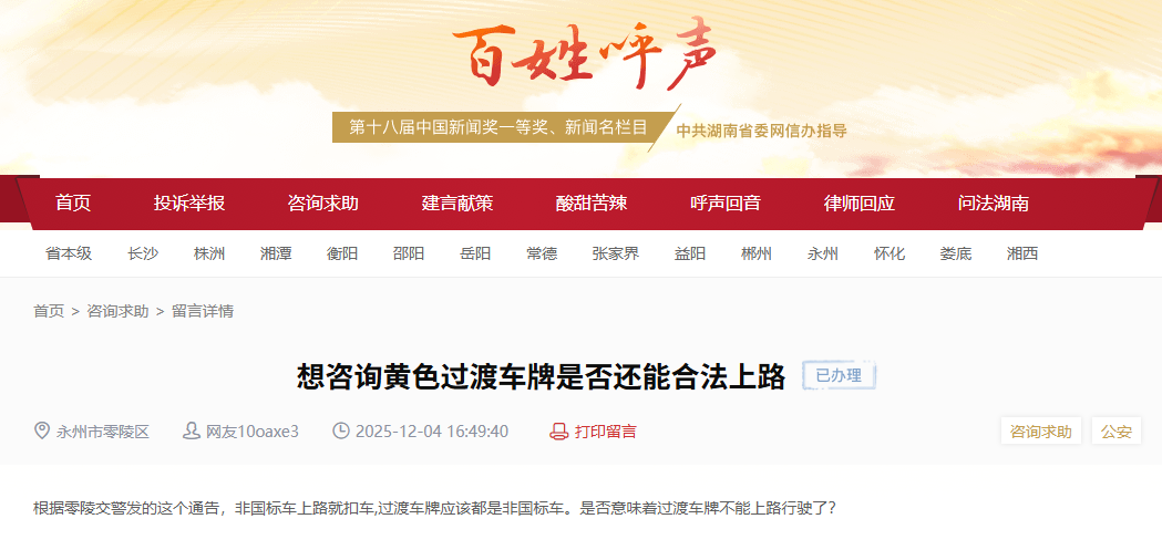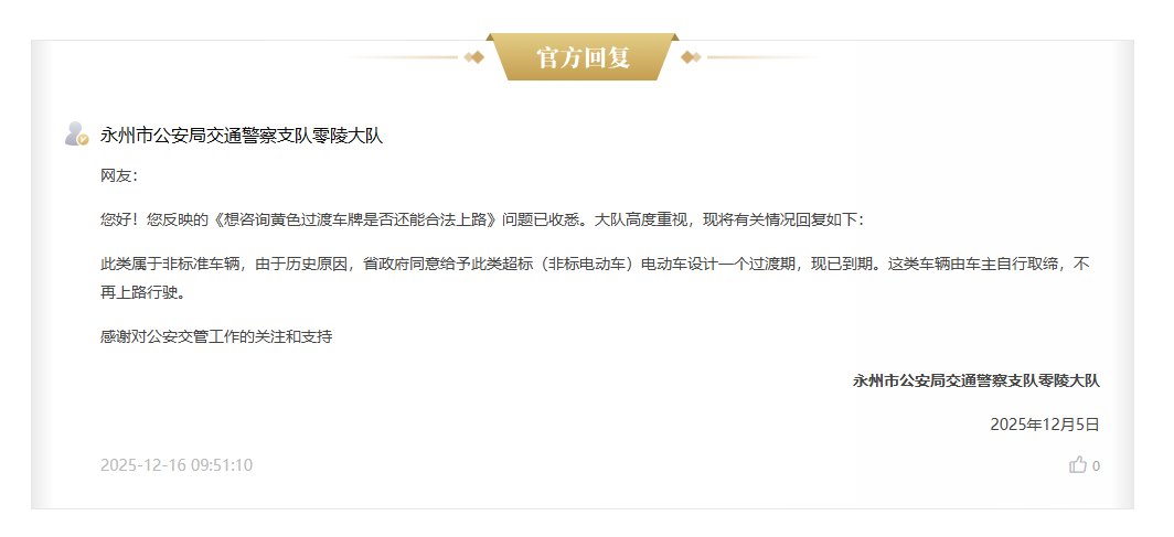 网友在《百姓呼声》栏目上的发帖内容与官方回应。 红网时刻新闻12月22日讯(记者 陈星晓)近日,有网友在红网《百姓呼声》栏目咨询“悬挂黄色过渡车牌的电动车是否还能合法上路”,反映零陵区交警部门此前发布通告,明确对“非国标车”上路将采取扣车措施,而黄色过渡车牌车辆属于非国标车,是否意味着此类车辆已不能继续上路行驶? 永州市公安局交通警察支队零陵大队随后对此作出回应。大队表示,网友反映的悬挂黄色过渡号牌的电动车属于“非标准车辆”。根据湖南省相关政策,此类超标(非标)电动车曾因历史原因获得一定过渡期,允许其临时上路行驶。目前,该过渡期已结束。交警部门明确,该类车辆应由车主自行取缔,不再上路行驶。 时刻新闻提醒广大车主,请及时核查所驾车辆是否符合现行国家标准,对已过过渡期的非标电动车应妥善处置,避免因违法上路受到查处。