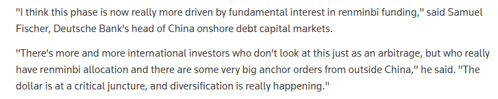 路透社网站报道截图 路透社关注到,哈萨克斯坦开发银行今年9月发行20亿元离岸人民币债券,这也是中亚地区首个公开发行人民币债券的金融机构。10月,印度尼西亚政府也成功发行离岸人民币债券,规模为人民币60亿元。这是东南亚主权机构首次发行以离岸人民币计价的长期限公募“点心债”。 报道援引德意志银行中国在岸债务资本市场主管塞缪尔・费希尔的观点称,“现阶段的人民币融资热潮,更多是由市场对人民币融资的根本性需求来驱动的”。他指出,“越来越多的国际投资者不仅仅把这看作套利,而是要真正将其纳入资产配置,并且已经有一些来自中国以外的大额锚定订单”。