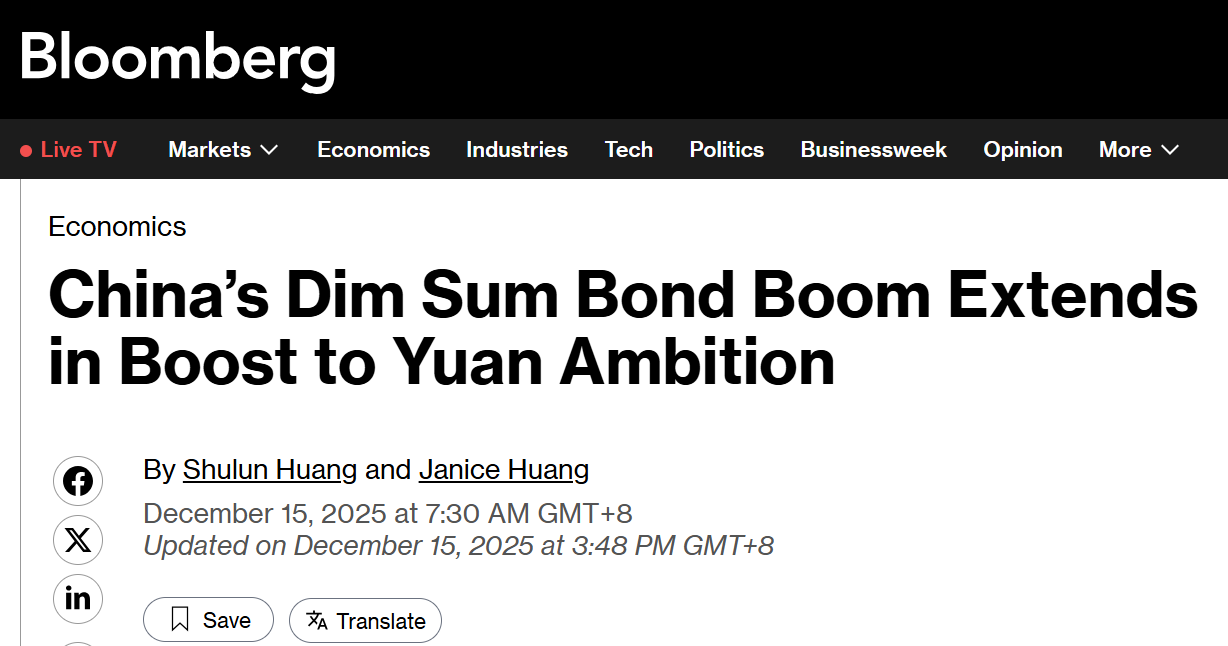 彭博社网站报道截图 新加坡《联合早报》在报道这一趋势时采访的专业人士分析,预计人民币收益率在中短期内不会出现大幅波动。中国央行的政策“适度宽松”、力度“温和”,未来料将维持稳健步伐。 报道还称,今年7月,中国央行宣布三项新的对外开放优化措施,包括完善债券通“南向通”运行机制,支持更多境内投资者“走出去”,拓展离岸债券市场投资渠道等。这些是中国推动人民币国际化的最新举措。 另一方面,印度尼西亚和哈萨克斯坦开发银行等机构今年首次发行人民币离岸债券,使得“点心债”发行人背景更加多元。 |