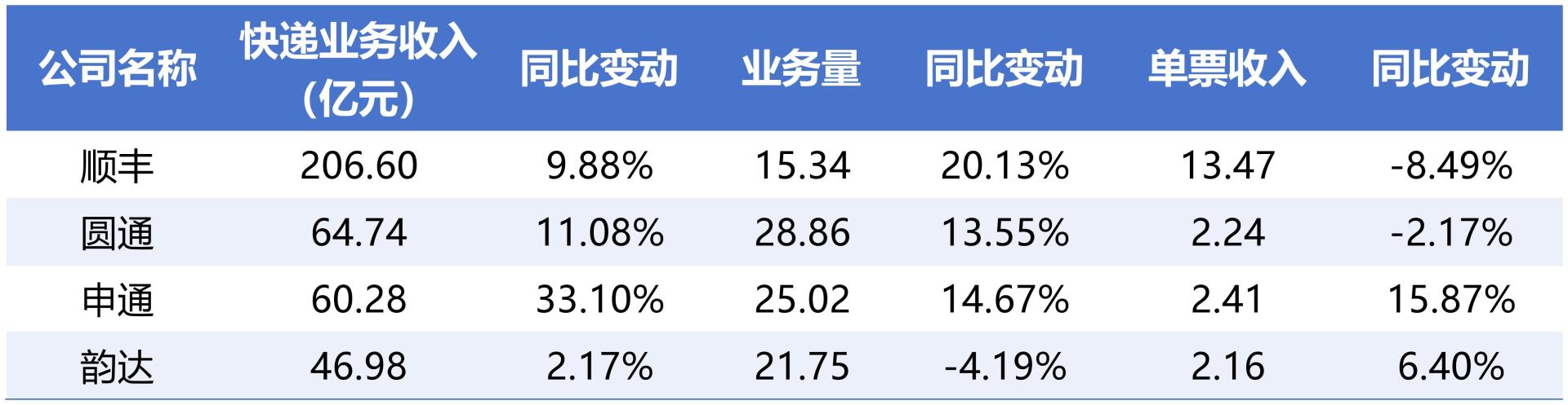 圆通11月快递产品收入达64.74亿元,同比增长11.08%;业务完成量28.86亿票,同比增长13.55%;快递产品单票收入为2.24元,同比下降2.17%。 申通快递11月快递服务业务收入为60.28亿元,同比增长33.10%;完成业务量为25.02亿票,同比增长14.67%;快递服务单票收入为2.41元,同比增长15.87%。 值得一提的是,申通快递在公告中披露,公司收购的浙江丹鸟物流科技有限公司100%股权已经完成工商变更登记手续,丹鸟物流及下属控股子公司自2025年11月起纳入公司合并报表范围,预计公司整体的快递业务量及快递服务收入规模将进一步增长。由此看来,丹鸟物流(后升级为“菜鸟速递”)作为服务于天猫超市等平台的配送网络,其并表一定程度上为申通带来了新的业务增量。 相比之下,韵达的业绩承压。数据显示,韵达11月快递服务业务收入为46.98亿元,同比微增2.17%;其核心指标——业务完成量为21.75亿票,同比下滑4.19%,成为已披露数据的头部公司中唯一出现业务量负增长的企业,快递业务收入增幅也只有2.17%。但值得一提的是,韵达单票收入同比提升了6.4%。这在一定程度印证了行业“反内卷”成效。 从业务量增速看,顺丰由于业务基数较其他三家公司低,继续领跑。今年以来,顺丰快递进一步加大对电商件的市场争夺,自3月以来,顺丰的单月业务量增幅均超过20%,多次领跑行业。 在今年三季报发布后,顺丰管理层在回答投资者提问时表示,在收入端,公司激活经营策略驱动件量增速跑赢行业,但业务结构仍有改进空间。“在‘先有后优’策略下,公司已经启动‘增益计划’,各地区全面梳理客情、调优件量结构,公司9月已经实现单价及毛利环比改善,预计四季度落地效果将更好。”顺丰管理层表示。 今年下半年,快递市场竞争格局发生微妙变化。第三季度,申通业务量达到65.15亿件,成功反超韵达(64.17亿件),这给持续承压的韵达带来了不小的市场压力。而且从10月、11月经营数据看,申通业务量继续超过韵达。 “反内卷”成效显著,11月旺季单票收入较7月均有所提高从旺季快递公司的单票收入看,自今年下半年行业明确提出“反内卷”、追求高质量发展以来,此前困扰行业多年的恶性价格战得到显著遏制。 自2025年8月开始,全行业有过一轮涨价潮,华创证券研报分析,11月份的单票收入较涨价前的7月份提升幅度分别为:圆通提升0.16元,韵达提升0.25元,申通提升0.44元(受并表丹鸟影响)。8月至11月的数据从单票收入角度验证了行业提价逻辑。这意味着,虽然同比数据因去年同期基数不同而有涨有跌,但若将时间线拉近观察,在今年8月行业呼吁快递头部企业集体涨价之后,主要快递企业的单票收入均已实现企稳回升。 信达证券研报分析,电商快递件量规模扩张增速仍在,直播电商进一步崛起背景下,一方面网购消费渗透率进一步提升,另一方面网购消费行为的下沉化和碎片化推动了单快递包裹实物商品网购额的下行,快递行业相对上游电商仍有超额成长性。 而对于未来的快递行业竞争秩序预测,信达证券分析,在快递行业“反内卷”背景下,8月以来行业价格逐步修复,行业持续推进高质量发展,快递格局或加速分化,建议关注“反内卷”后续进展及行业格局变化。 综合来看,A股快递行业正在经历一场深刻的格局演变。“以价换量”的旧剧本逐渐淡出,“价值竞争”的新篇章正在开启。未来,行业的竞争焦点将更多转向差异化服务、成本管控效率与综合物流生态的构建,市场集中度有望进一步提升,龙头企业的优势或将更加巩固。 免责声明:本文内容与数据仅供参考,不构成投资建议,使用前请核实。据此操作,风险自担。 封面图片来源:每经记者 黄鑫磊 摄 |