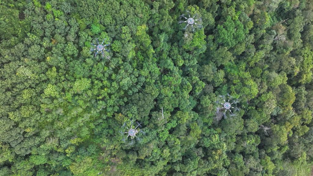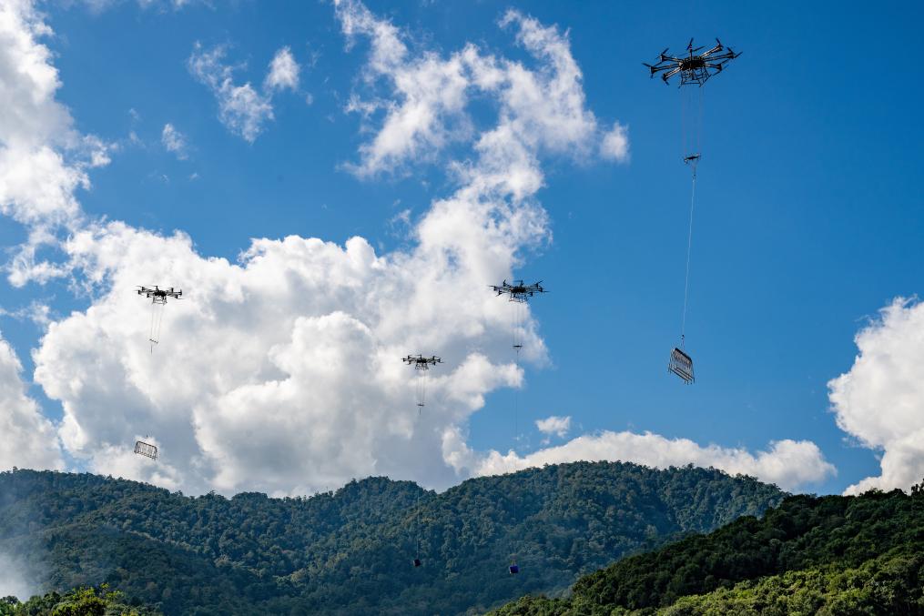 中老500千伏联网工程在施工过程中运用无人机集群作业方式开展施工物资运输。(张强 摄) “增加成本也要最大限度保护雨林生态。”付卫斌说。最终评审会上,团队决定放弃传统施工方式,追加约1000万元成本,保住103亩原始雨林。 随后,设计团队对线路走向进行了28处重大调整。优化后,线路穿越雨林比例从32%降至20%,涉及的保护区从13个减少到8个。 “为了保护生态环境,宁可多投入也要调整方案,这很难得。”西南林业大学教授邓志华说,该项目坚持生态优先、绿色发展理念,最大限度减少了环境影响,实现了工程建设与生态保护的兼顾。 全用空中运输 不修施工道 在雨林里施工,最大的难点不是建塔,而是“把材料送上山”。 施工人员算过一笔账:5000吨物资,如果依靠20名工人肩挑背扛,需要约421个工日;如果搭建索道,则需新建15条运输通道,不仅周期长,也会对生态环境造成较大扰动。 “但这里的树,一棵都不能动。”云南送变电工程公司职工创新工作室负责人李春说。 为此,工程建设团队创新采用“高低空协同”运输模式:2架米-171直升机负责500公斤以上大件物资吊运,30多架大、中、小型重载无人机组成灵活机队,覆盖从几公斤工具到905公斤超重塔材的运输需求。 针对大重量运输难题,团队研发出“四机联吊”技术,经过数百次试验调试,攻克多机协同控制、载荷均衡分配等关键技术。目前,“四机联吊”单次运输重量已突破500公斤,创造了单日飞跃高差220米、运输直线距离900米的雨林运输纪录。