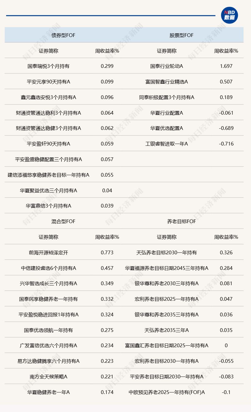 每经记者|任飞 每经编辑|赵云 上周,A股市场呈现V型反转,但部分类型的FOF普遍出现净值回撤。尤其是养老目标FOF当中,许多在上周没有实现正收益。 临近年底,公募行业的人员变动仍在发生,其中也有业内知名的基金经理,上周出现多例FOF经理离任。不过,总的来看,今年以来的FOF扩容比较明显,越来越多投资人开始正视并且接受FOF投资工具。 市场V型反转,但部分FOF胜率偏低上周(12月15日至21日),A股市场V型反转,宽基指数方面,上证指数报收3890.45点,上涨0.03%,深证成指报收13140.21点,下跌0.89%,创业板指报收3122.24点,下跌2.26%。板块方面,商贸零售、非银金融、社会服务板块涨幅居前。 不过,权益类FOF的表现并没有取得较高投资胜率,部分类型的FOF投资胜率较低。以养老目标FOF为例,116只此类产品当中(统计初始基金)只有7只录得正收益。 从绩优产品来看,股票型FOF中的国泰行业轮动A业绩居前,单周实现1.70%的收益率,是所有FOF基金中业绩最好的一只。今年第三季度,该FOF不仅重仓了永赢中证沪深港黄金产业股票ETF、国泰中证沪深港黄金产业股票ETF等一众近一周表现较好的基金,还配置了一些有色、资源类个股,例如招金矿业、赣锋锂业(港股)等,均在近期有不错的表现。 在业内看来,此起彼伏的A股行情,目前依然是资金轮动市,想要短期内形成合力难度较大。中金公司认为,中期向好逻辑没有改变,配置上,逢低布局成长风格,红利风格注重阶段性、结构性机会。 华安证券的研报分析指出,上涨信号仍需等待。其进一步表示,维持市场高位震荡的判断,仍需等待进一步明确的上涨信号。配置思路上,历史上看大涨年份次年1月份波动加大,短期或仍面临调整风险。具体可布局的方向上,AI产业景气趋势明确,中长期核心主线地位稳固,调整压力提供了下阶段行情良好布局时机。 而对于债券市场,今年以来,债市投资者普遍体感不佳,收益率运行节奏与宏观周期相对脱敏,但与机构行为高度绑定。尤其是下半年,多数时间就是机构行为主导下的行情。 核心原因还是经过较长时间的高强度供给,机构资产负债表扩张可能已经来到了一个边界值附近,机构行为从前期的一致做多转为在多个时间点上出现强烈分歧。分析指出,机构行为上的高度分歧体现为市场增量资金缺乏,债券承接能力有所弱化,这在长债和超长债上尤为明显。 又有公募FOF基金经理离任,年内FOF扩容明显临近年底,公募FOF行业又有一些知名基金经理开始离任所管理的基金产品。 12月20日,兴证全球基金公告,林国怀离任兴全优选积极三个月持有混合(FOF)。林国怀曾任职于多家金融机构,历任天相投资顾问有限公司基金分析师,在瑞泰人寿保险、合众人寿资产管理中心等任职。现任兴证全球基金管理有限公司总经理助理、FOF投资与金融工程部总监、养老金管理部总监。 同样在上周,易方达基金公告,张浩然离任易方达稳健腾享六个月持有混合FOF。张浩然曾任中国人寿资产管理有限公司基金投资部助理研究员,易方达基金管理有限公司研究员、投资经理、易方达汇诚养老目标日期2038三年持有期混合型发起式(FOF)基金经理助理,现任基金经理。 有分析指出,就行业发展来看,基金经理承担了巨大的管理压力、社会责任,但收入设置了上限,有些基金经理觉得性价比低就开始卸任或者转战私募,不过,从今年公募FOF的发展来看,扩容的成效非常明显。 Wind统计显示,截至12月21日,公募FOF在2025年新成立81只,发行规模810.68亿元,有8家公募的FOF业务管理规模突破百亿元。资料显示,自2017年诞生以来,FOF已成为个人投资人进行一站式资产配置的工具,其稳定发行态势反映了居民对专业资产配置需求的增长。 FOF缘何如此受青睐?在业内人士看来,多只绩优FOF规模大增,主要是采取多资产配置策略,基金净值平稳向上,吸引较多资金涌入。与此同时,头部银行渠道越来越重视FOF产品,与基金公司合作打造FOF优选池。 也有分析指出,在当前的公募基金产品里,只有FOF可以通过投资基金的方式,来实现多资产配置,由于股、债、黄金、海外等品种可以相互对冲,减少了对股、债的依赖,开创了新类型的低波“固收+”产品,在今年以来的结构性股市行情和震荡的债市行情中,这种产品受到不少投资者青睐。