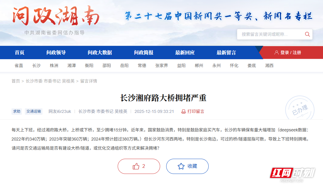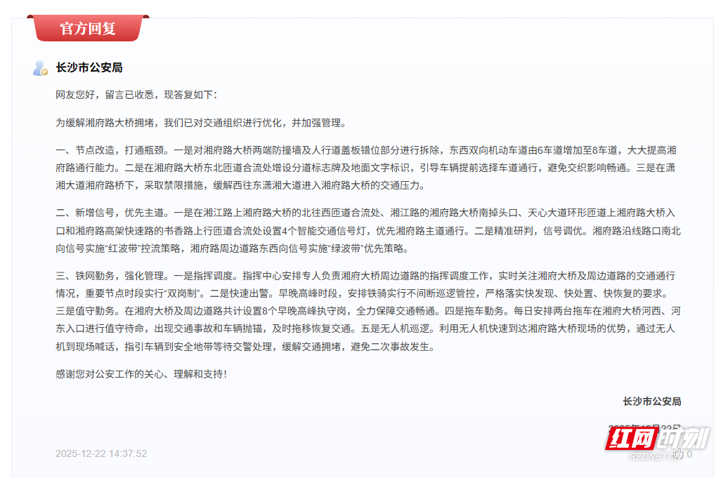 网友在《问政湖南》栏目上的发帖内容与官方回应。 红网时刻新闻12月23日讯(记者 陈星晓)近日,有网友在红网《问政湖南》栏目反映,长沙湘府路大桥在工作日早晚高峰拥堵严重,通行车辆常常需要排队至少15分钟。网友指出,随着长沙市汽车保有量持续攀升,连接河东与河西、尤其是南部区域的过江通道数量有限,进一步加剧了跨江通勤压力,并询问是否有计划通过新建桥隧或优化交通组织等方式来缓解拥堵。 对此,长沙市公安局作出公开回应,详细介绍了为缓解该路段拥堵已采取的一系列交通组织优化与管理强化措施: 节点改造,打通瓶颈 一是对湘府路大桥两端防撞墙及人行道盖板错位部分进行拆除,东西双向机动车道由6车道增加至8车道,大大提高湘府路通行能力。二是在湘府路大桥东北匝道合流处增设分道标志牌及地面文字标识,引导车辆提前选择车道通行,避免交织影响畅通。三是在潇湘大道湘府路桥下,采取禁限措施,缓解西往东潇湘大道进入湘府路大桥的交通压力。 新增信号,优先主道 一是在湘江路上湘府路大桥的北往西匝道合流处、湘江路的湘府路大桥南掉头口、天心大道环形匝道上湘府路大桥入口和湘府路高架快速路的书香路上行匝道合流处设置4个智能交通信号灯,优先湘府路主道通行。二是精准研判,信号调优。湘府路沿线路口南北向信号实施“红波带”控流策略,湘府路周边道路东西向信号实施“绿波带”优先策略。 铁网勤务,强化管理 一是指挥调度。指挥中心安排专人负责湘府大桥周边道路的指挥调度工作,实时关注湘府大桥及周边道路的交通通行情况,重要节点时段实行“双岗制”。二是快速出警。早晚高峰时段,安排铁骑实行不间断巡逻管控,严格落实快发现、快处置、快恢复的要求。三是值守勤务。在湘府大桥及周边道路共计设置8个早晚高峰执守岗,全力保障交通畅通。四是拖车勤务。每日安排两台拖车在湘府大桥河西、河东入口进行值守待命,出现交通事故和车辆抛锚,及时拖移恢复交通。五是无人机巡逻。利用无人机快速到达湘府路大桥现场的优势,通过无人机到现场喊话,指引车辆到安全地带等待交警处理,缓解交通拥堵,避免二次事故发生。 此外,长沙市自然资源和规划局也进一步回应网友,表示根据长沙市国土空间规划,长沙将构建功能完善、等级匹配、畅通、高效、安全的城市道路网体系,规划形成以高快速路为骨干,主干路为主体,内通外达的城市道路网骨架。优化跨湘江通道格局,破解跨湘江交通瓶颈。规划至2035年,长沙都市区布局31座过湘江通道。经规划核实,湘府路大桥周边规划有先导路过江通道,建成后能一定程度上缓解湘府路大桥交通拥堵。